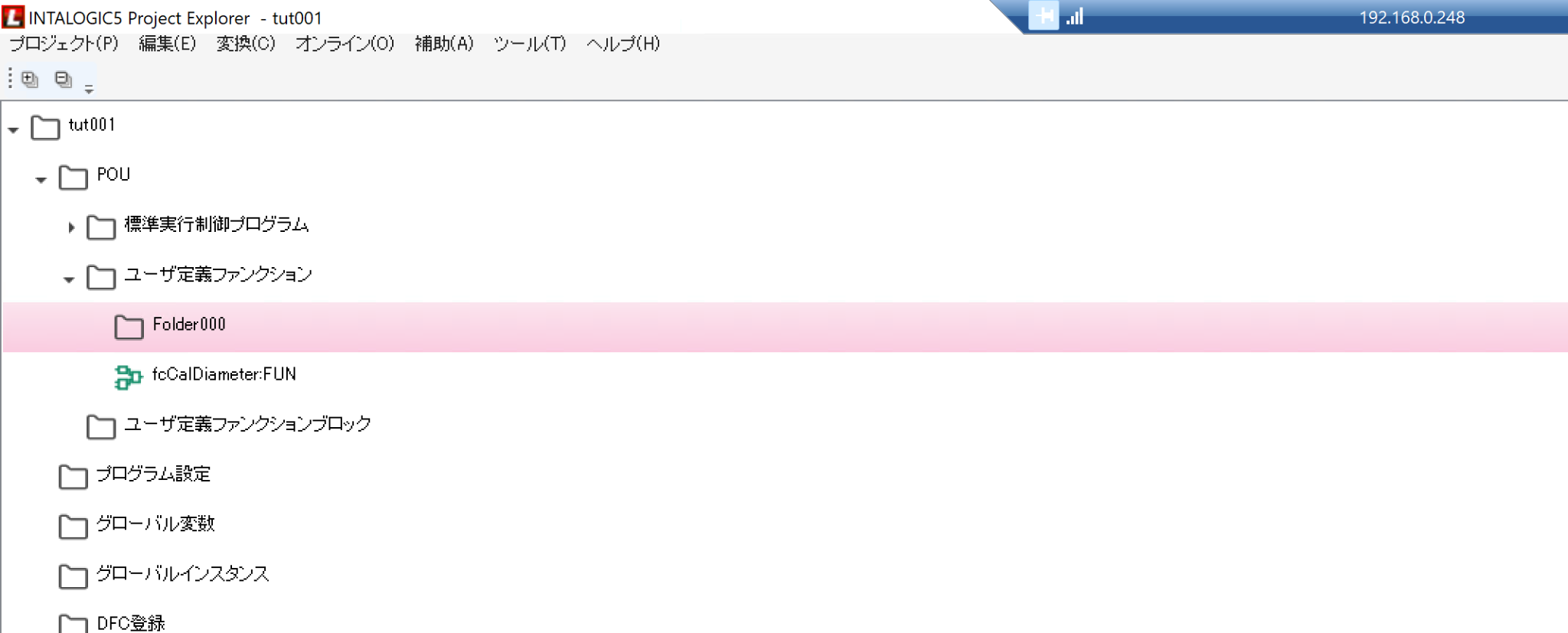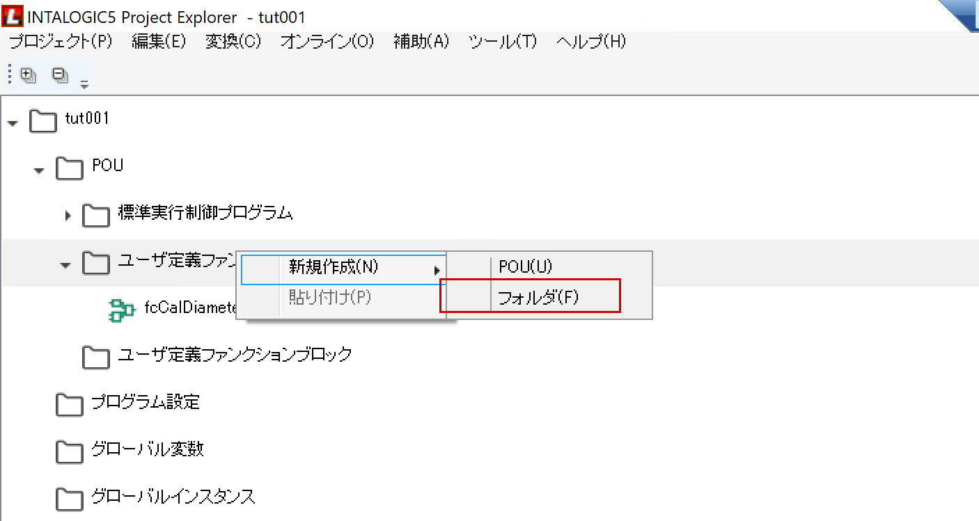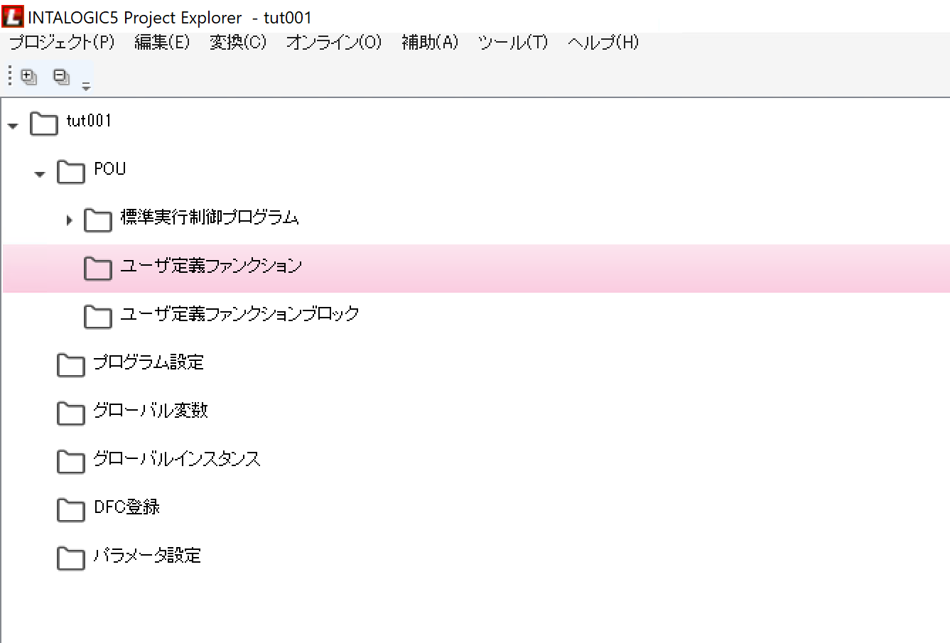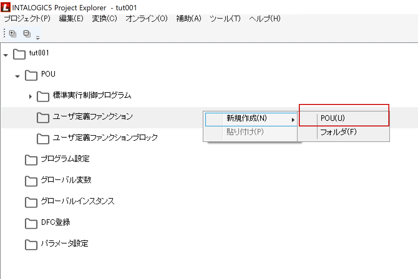 INTALOGIC5ツールを起動すると、POU→ユーザ定義ファンクションという項目があります。