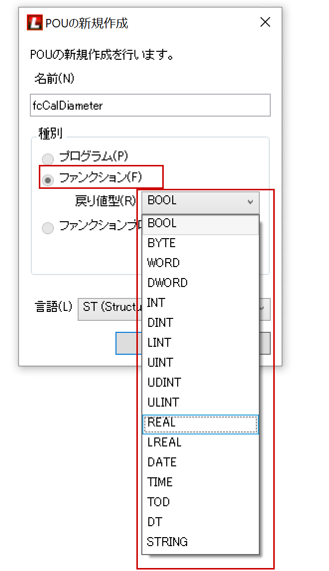 種別にはファンクションを選び→戻り値をDrop-ListからReal(実数)を選択します。