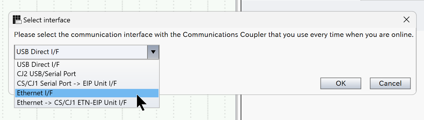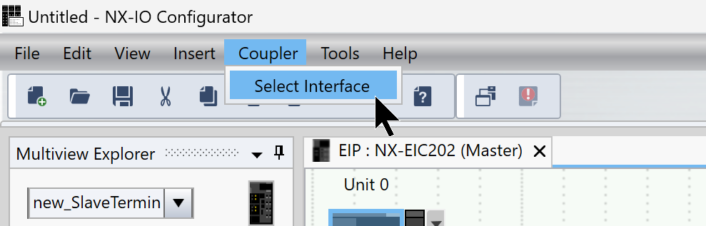 次はPCとEIC202 Ethernet/IPカプラーを接続するため、Coupler→Select Interfaceします。