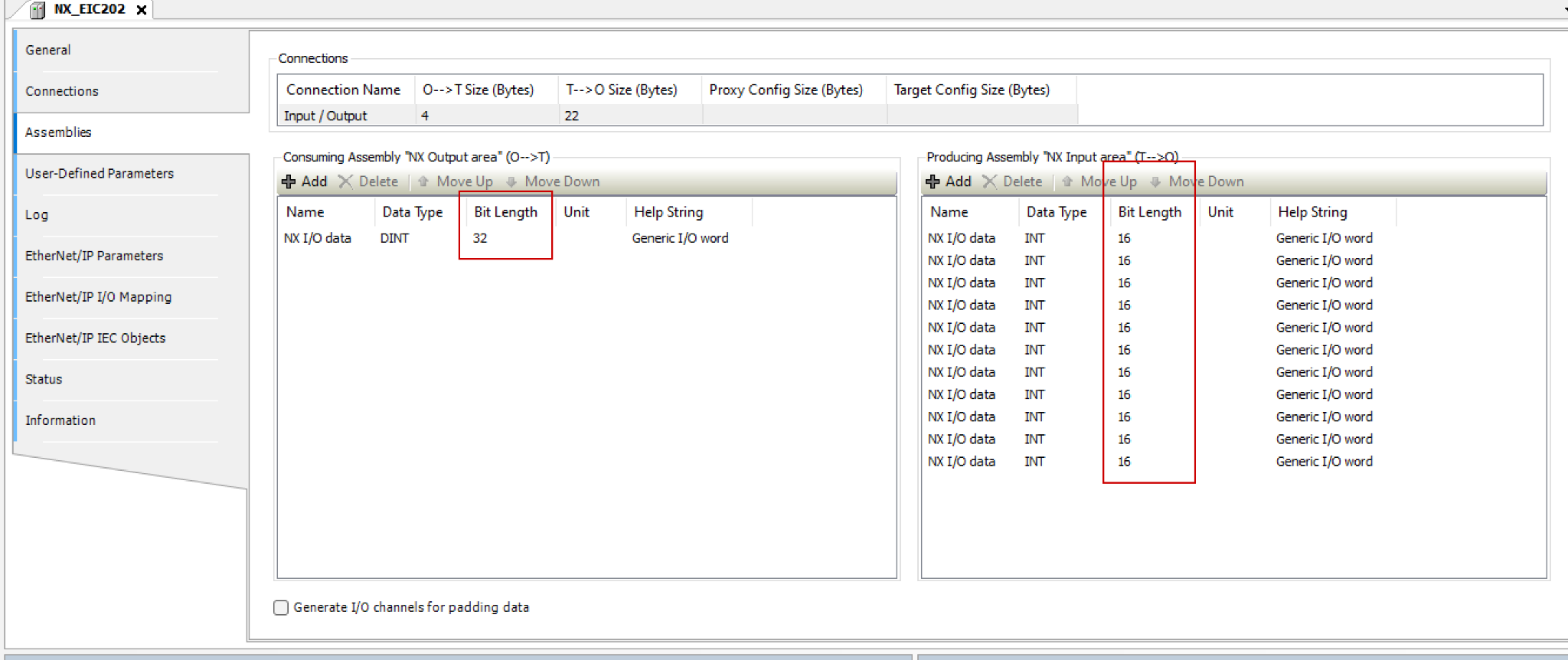 次はAssemblies Tabを開き、O->TとT->OのTag数を先程設定したByte数に合わせて新しいAssembliesを追加しましょう。下図では、
