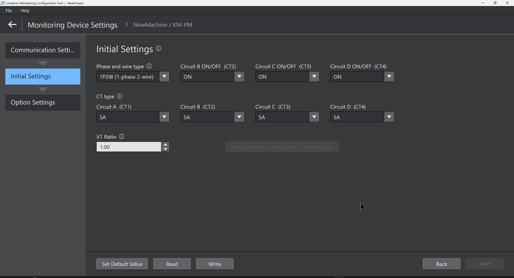 今回の例では1P2Wの構成なので、CT1-4を使用します。そして各CTの変換範囲を設定し→Writeでパラメータを本体に書き込みましょう。