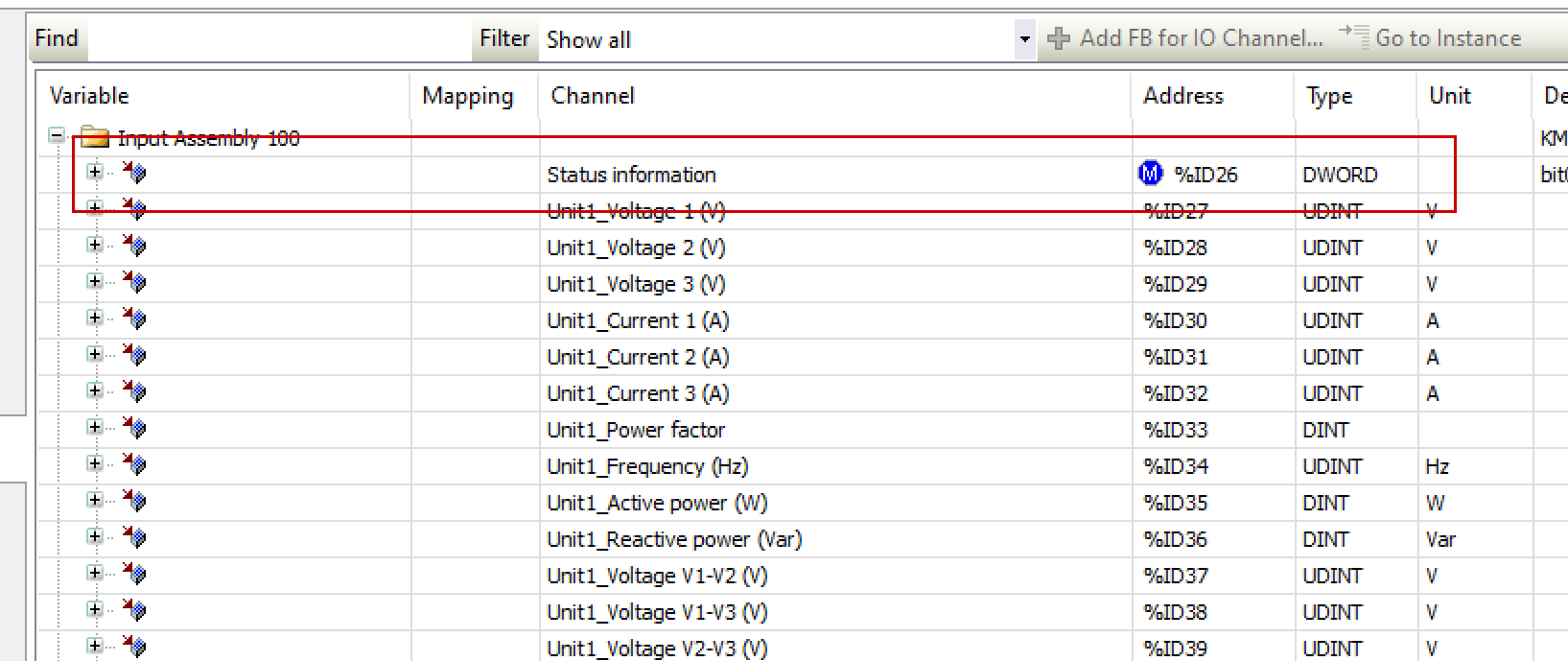 こちらはオムロンのKM-PMBN-EIPのEthernet/IP接続に合わせて作成した構造体です。