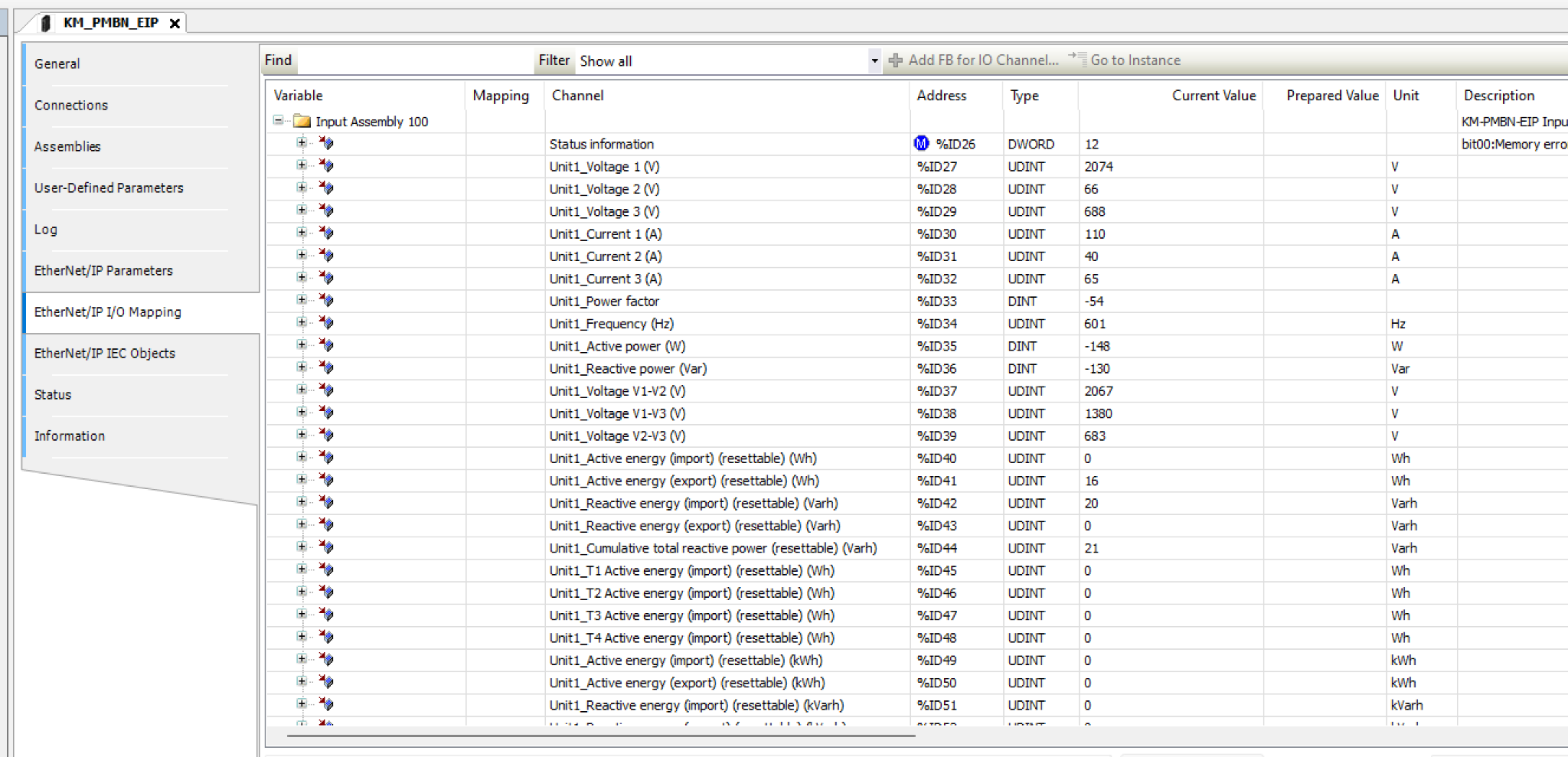 最後はアドレスの設定ですね。オムロンのKM-PMBN-EIPには各接続の項目に分かれていますので、前頭にアドレスを強制的に設定すれば、GVLのMapping が楽になります。