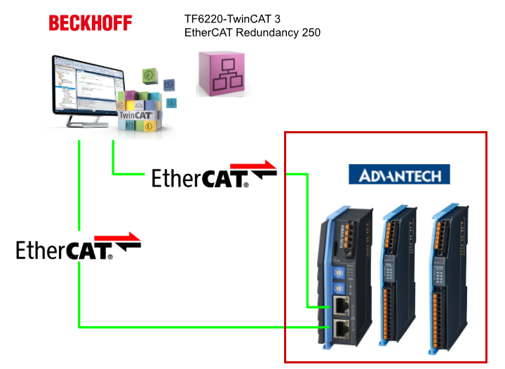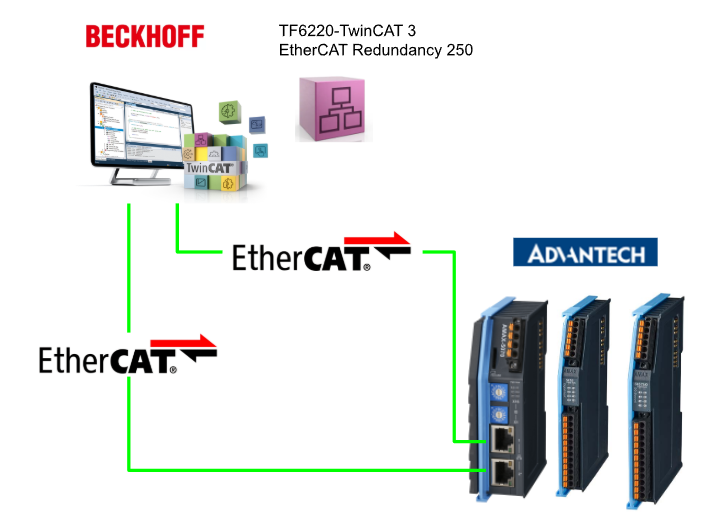 今回の記事ではBeckhoff TwinCAT3 TF6220を使用し、簡単なEtherCAT二重化ネットワークを構築します。記事内で使用してるのはAdvantech社製EtherCATカプラ「AMAX-5074」です。