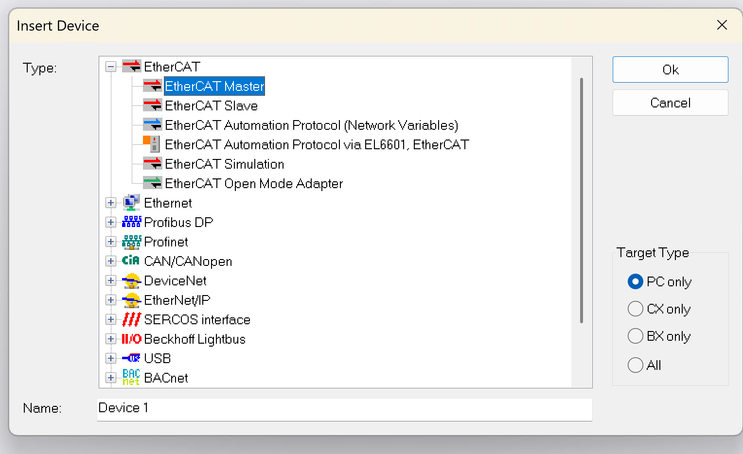 「Add New Item…」を選択すると、「Insert Device」ウィンドウが開きます。ここでは追加するデバイスのタイプを選択できます。今回はBeckhoffのEtherCATマスターを使用するため、EtherCAT → EtherCAT Masterを選択します。