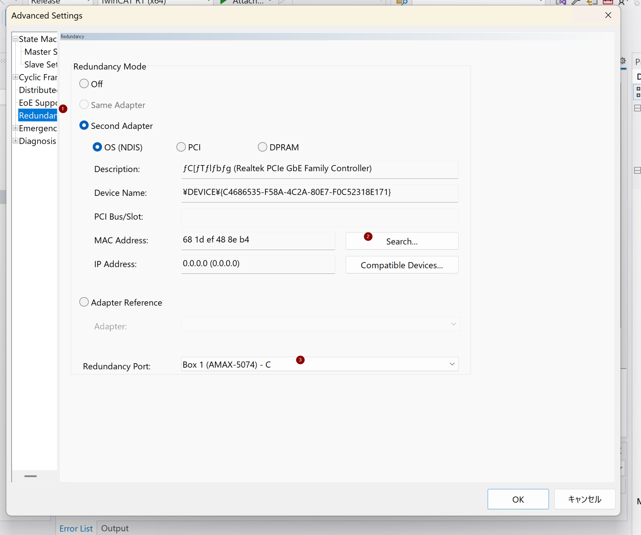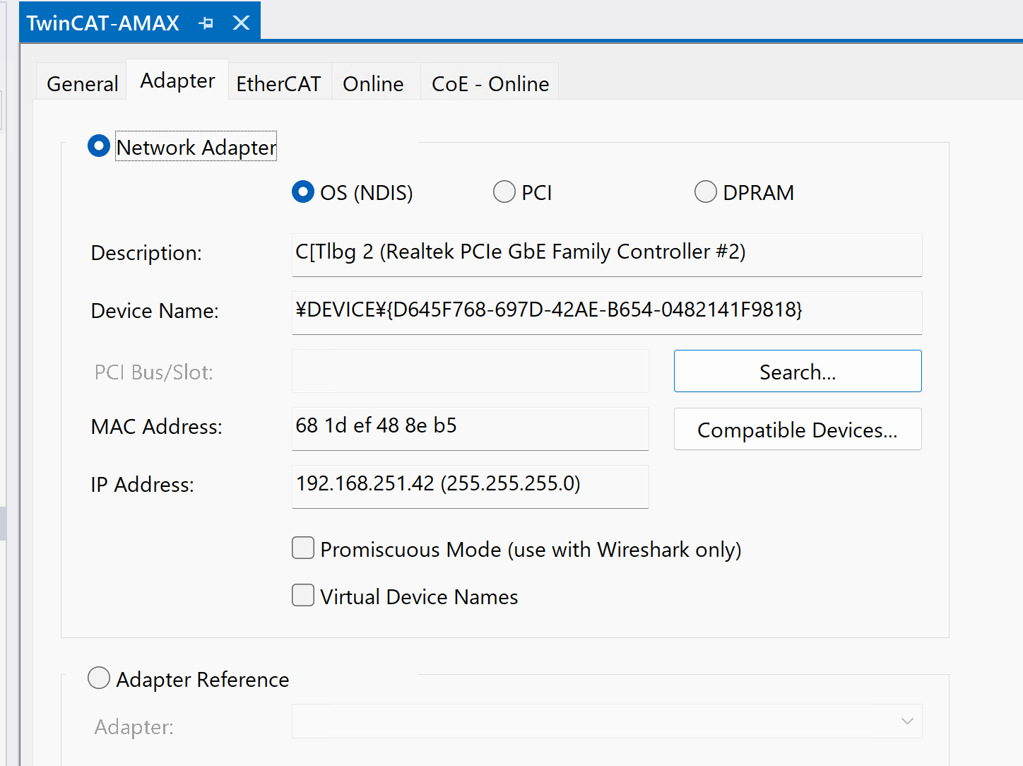 この画面はTwinCATのEtherCATマスター設定におけるAdapter(アダプター)タブで、EtherCAT通信に使用するネットワークアダプターを選択・設定します。