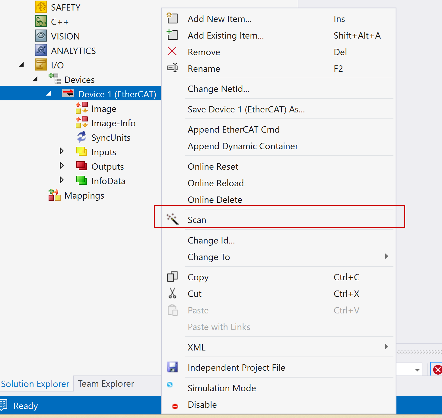 EtherCATマスター(Device 1)を右クリックすると、表示されるメニューの中に「Scan」があります。この「Scan」をクリックすることで、TwinCATが実際に接続されたEtherCATスレーブ機器を自動検出し、構成に追加してくれます。この機能は、複数のI/O端子や通信モジュールがEtherCATラインに接続されているときに非常に便利で、機器のE-Bus順に正確に取り込むことが可能です。