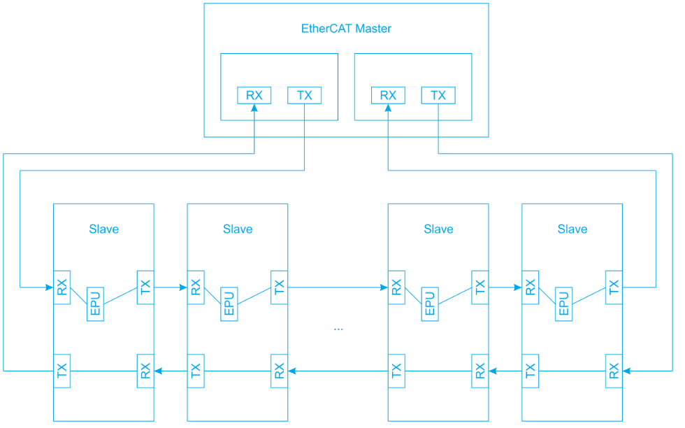 一方のアダプターからのフレームは、入力ポートとしてポートAを通過する際に、EPUを介してスレーブデバイスとデータを交換します。リングトポロジー内のもう一方のアダプターからのフレームは、入力ポートとしてポートA以外のポートを経由する場合、スレーブデバイスからのデータは書き込まれません。ポートAからポートBへの経路ではフレームはEPUを介してスレーブデバイスとデータを交換できますが、ポートBからポートAへの経路ではフレームはスレーブデバイスからデータを受け取りません。