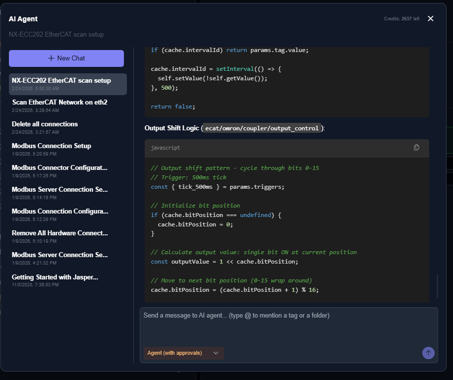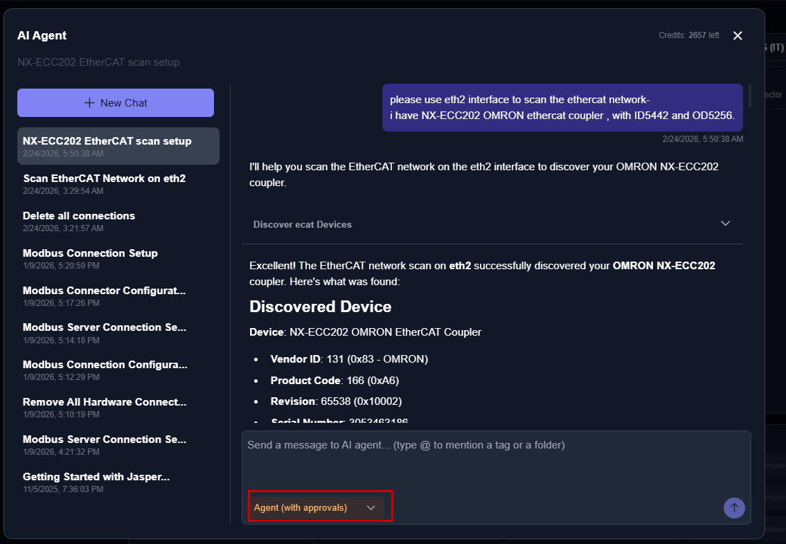 EtherCAT接続を作成する最中にステップを確認したいので、チャットモードをAgent(With approvals)に変更します。そのモートではAI Agentが行動を実行する前に必ずUSERの了承が必要です。