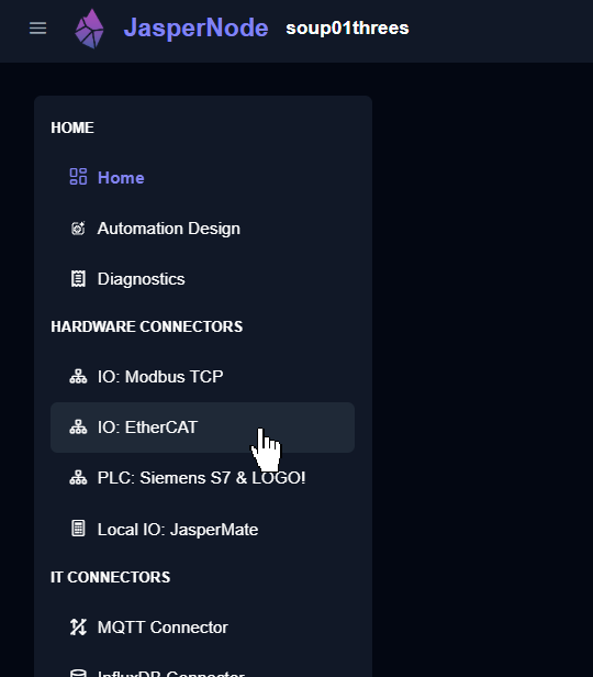 次はJasperNodeの左側にあるHARDWARE CONNECTORS→IO EtherCATをクリックします。