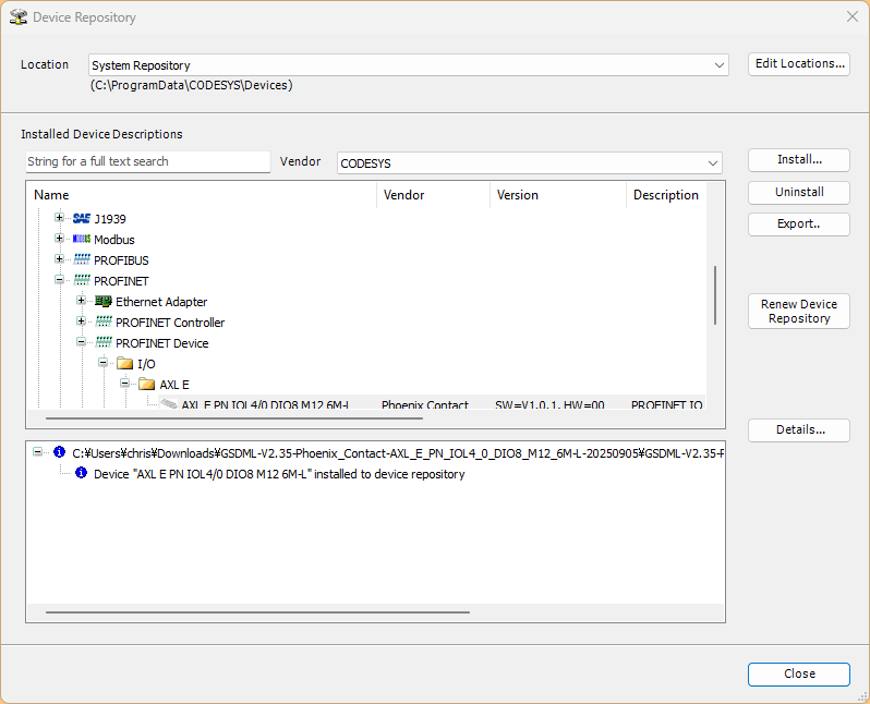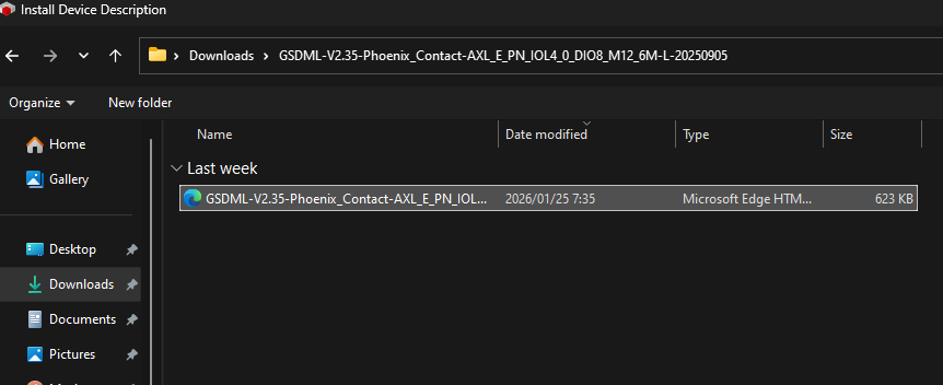 今回記事で使用するAXL E PN IOL4/0 DIO8 M12 6M-LのGSDML FILEをインストールしましょう。