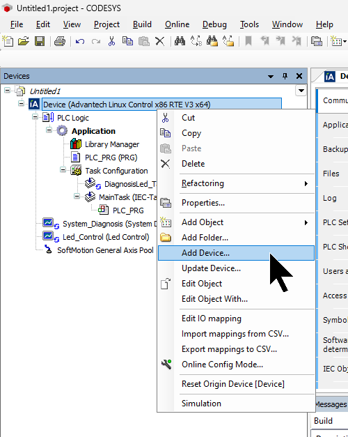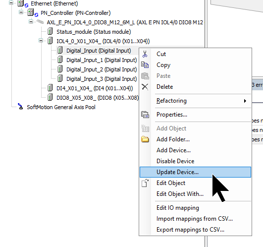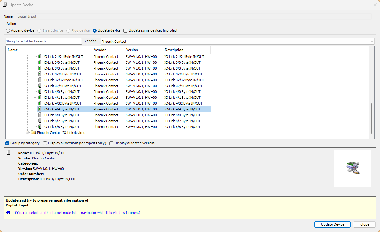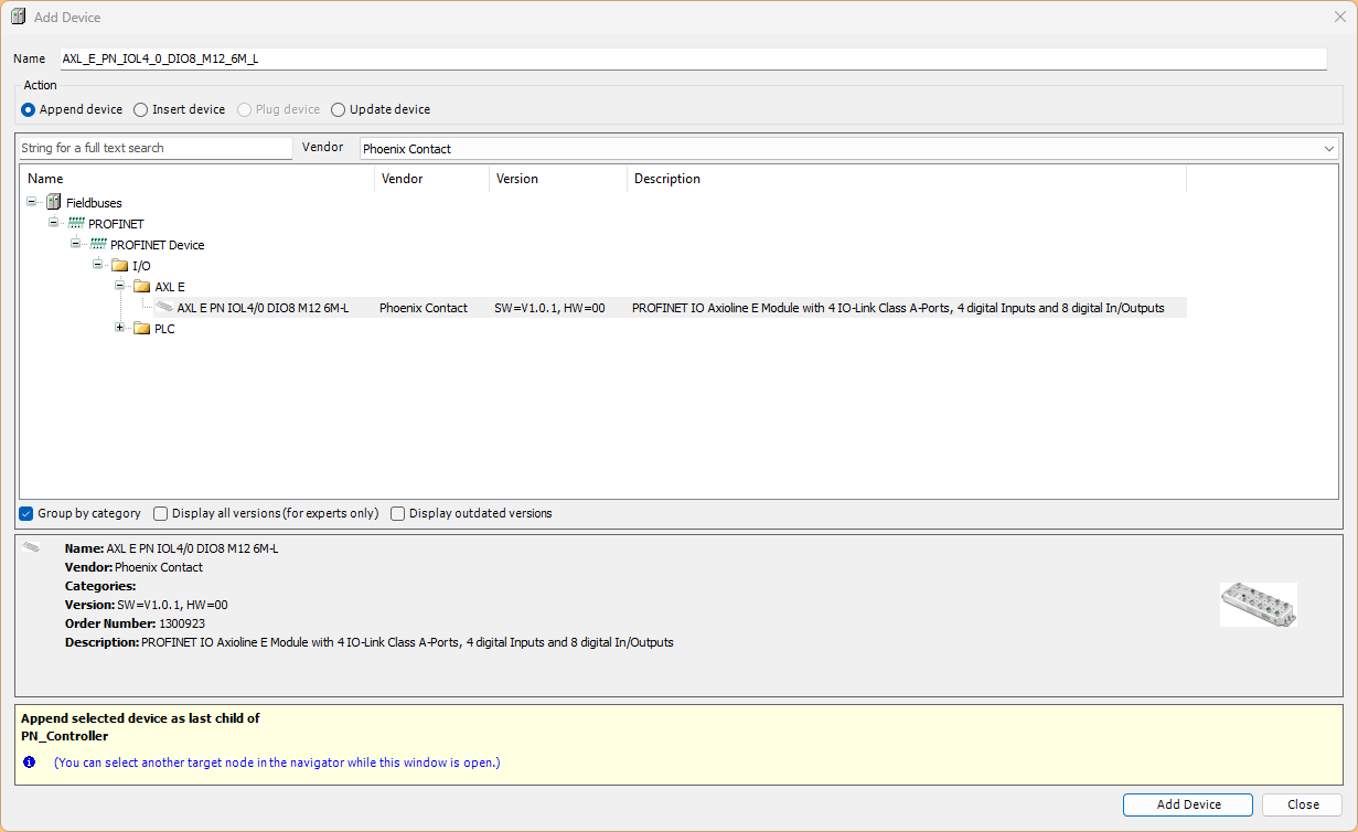 Profinet IO Controllerを右クリック→Add Deviceで今度は記事で使用するPhoenix Contact製のIO-LinkマスターAXL E PN IOL4/0 DIO8 M12 6M-Lを追加します。