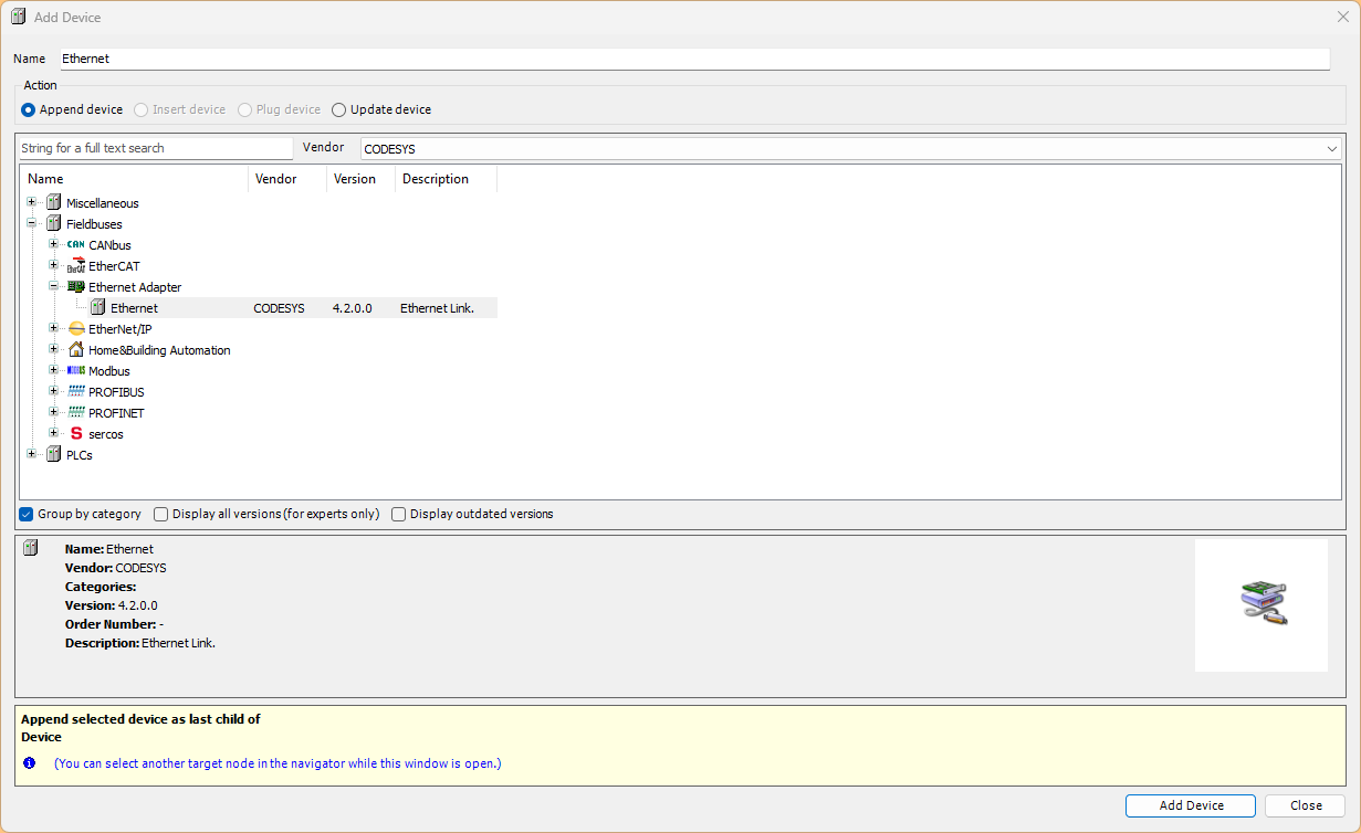 今度はEthernet Driverを追加するために、Device→Add Deviceします。