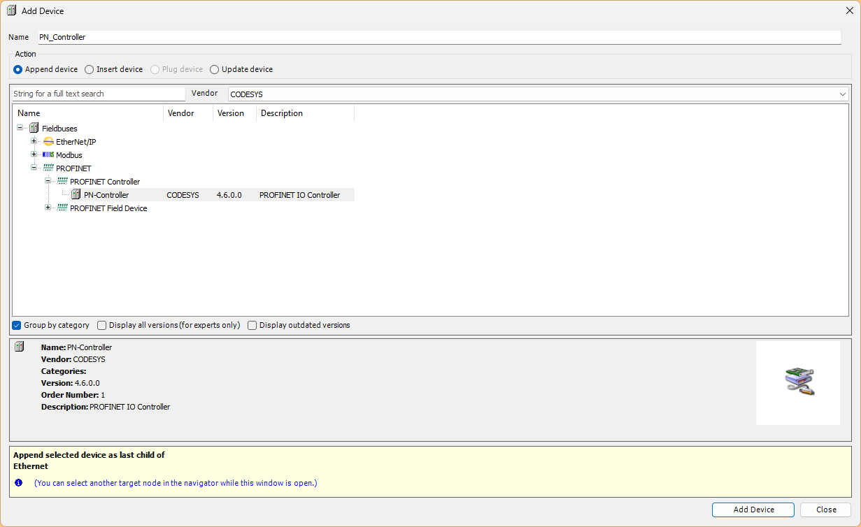 今度はEthenret Driver右クリック→Add Deviceします。そしてPROFINET→PROFINET Controller→PN-Controllerをクリックします。