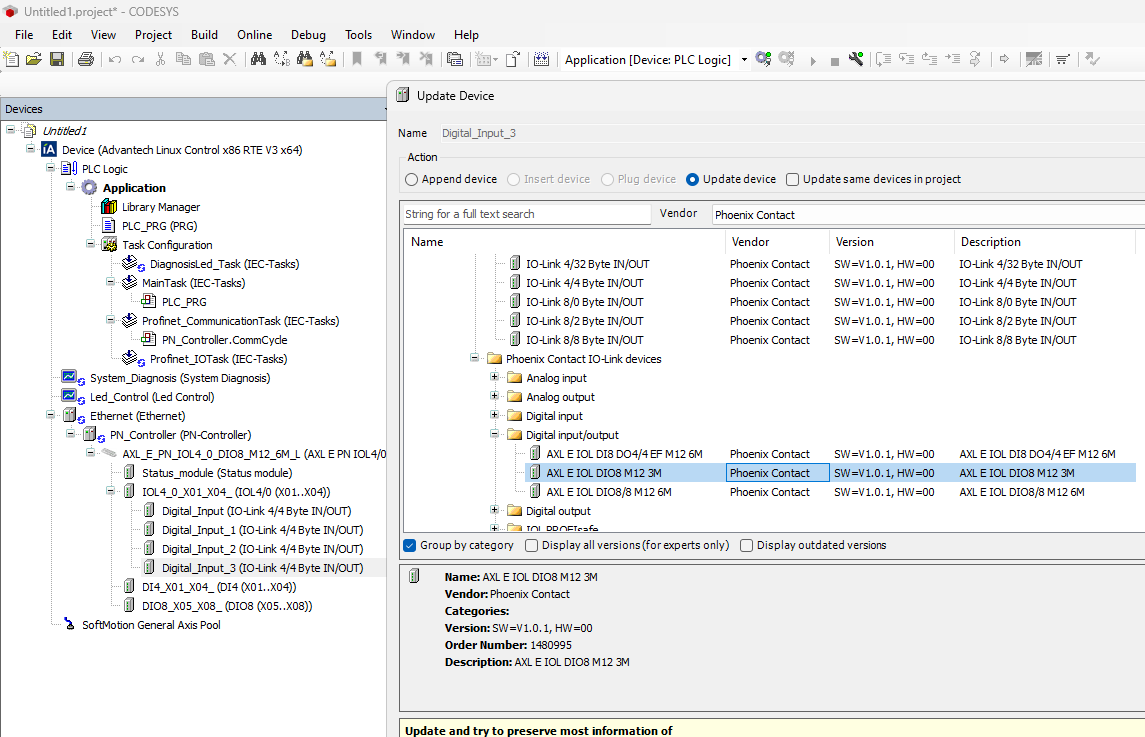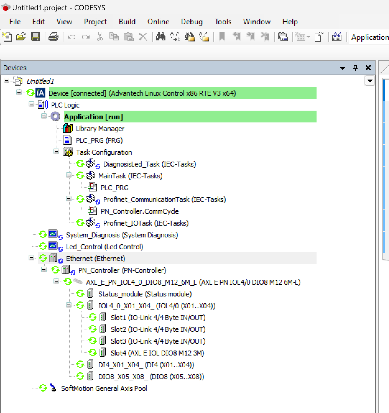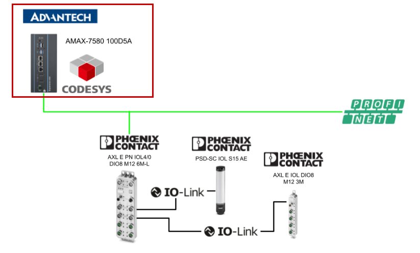 下図のようにAdvantech AMAX-7580 100D5AのCodesys RuntimeがPhoenix ContactのPhoenix ContactのAXL E PN IOL4/0 DIO8 M12 6M-Lと正常に接続しています。
