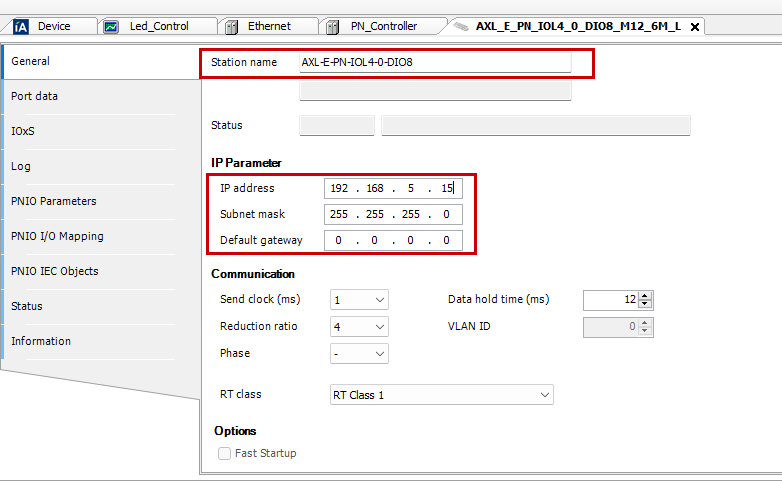 今度はIO-LinkマスターAXL E PN IOL4/0 DIO8 M12 6M-LのIPアドレス・デバイス名を設定します。