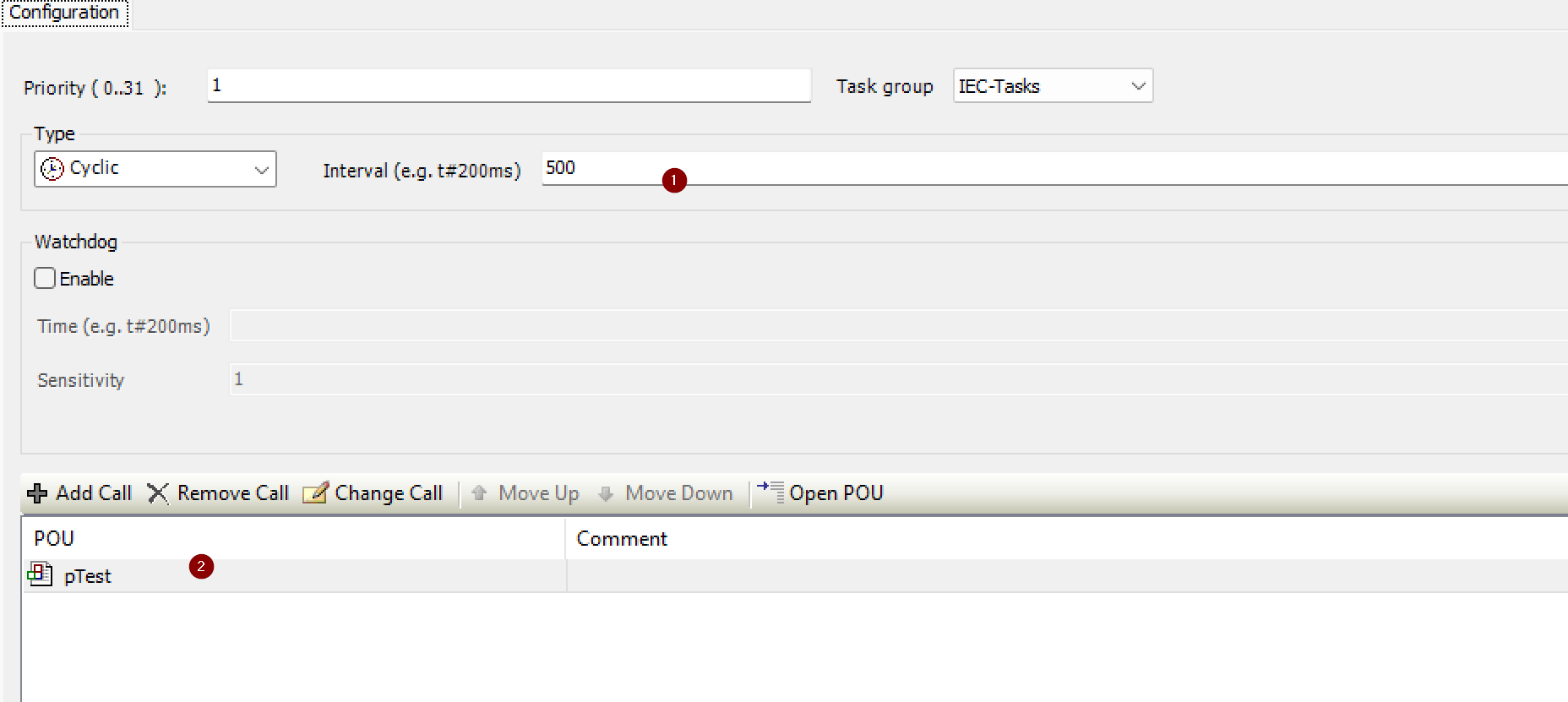 Intervalの欄に実行サイクルタイムを設定し、POUで先程作成したプログラムを追加しましょう。