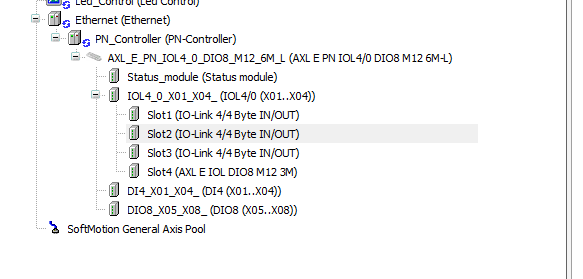 他のスロットも同じ操作にしましょう。また、Port4ではPhoenix Contact製のAXL E IOL DIO8 M12 3M と接続していますので、Phoenix Contact IO-Link devices→Digital Input/Output→AXL E IOL DIO8 M12 3M を設定しましょう。