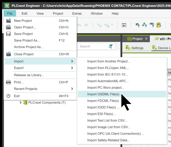 PLCNEXT EngineerツールからGSDMLをIMPORTするために、File→Import→Import GSDML Filesをクリックします。
