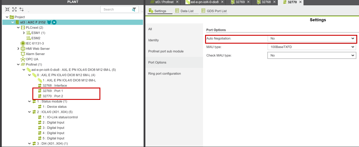 次はAXL E PN IOL4/0 DIO8 M12 6M-LのPort1・Port2にある”Auto Negotiation”をNOに設定します。