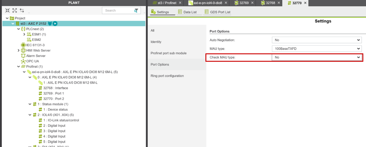 また、AXL E PN IOL4/0 DIO8 M12 6M-LのPort2に接続するProfinetデバイスがないので、Port2の”Check MAU Type”をNoに設定します。
