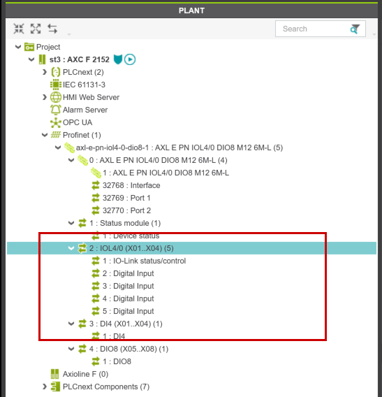 下図の赤枠に示したのはAXL E PN IOL4/0 DIO8 M12 6M-Lの現在のスロット設定です。Default上ではPort1-Port4まではデジタル入力になっています。
