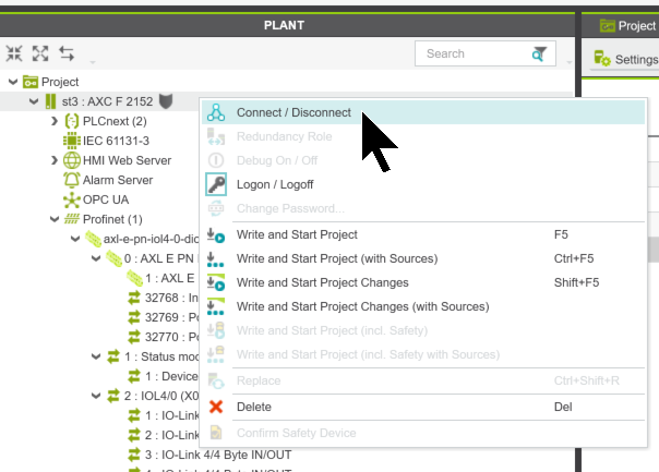 今度はPLC ENGINEERとAXF2152と接続するために、PLCを選択し→右クリック→Connect/Disconnectします。