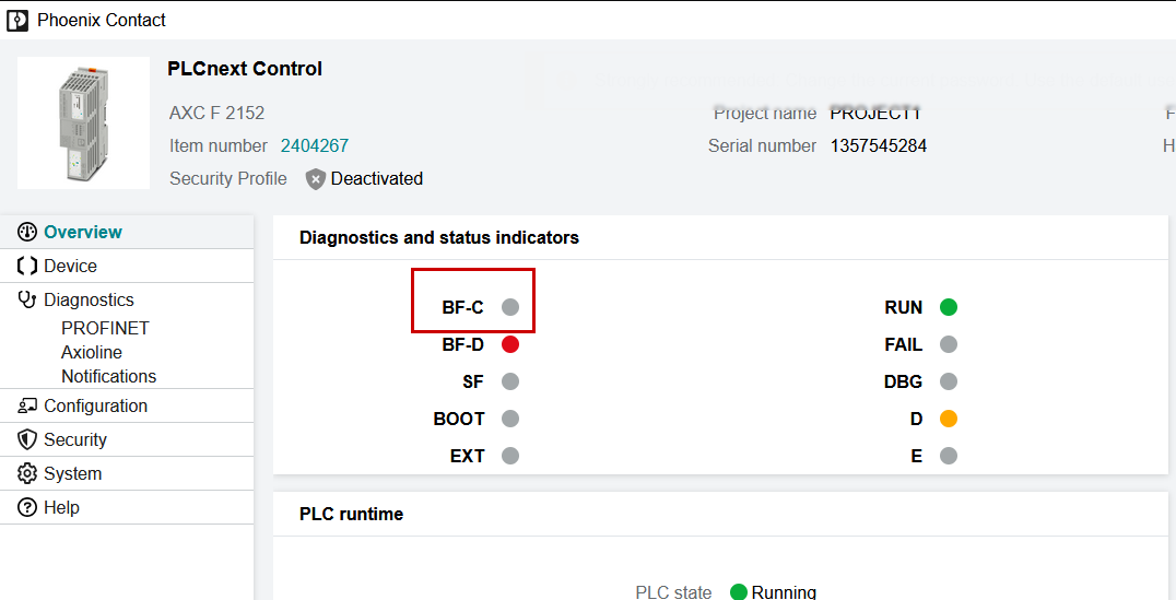 AXF2152のProfinet通信状態を確認するために、AXF2152のWeb Serverにアクセスし→Overviewを開きます。下図のようにBF-Cが赤ではなければ通信OKです。