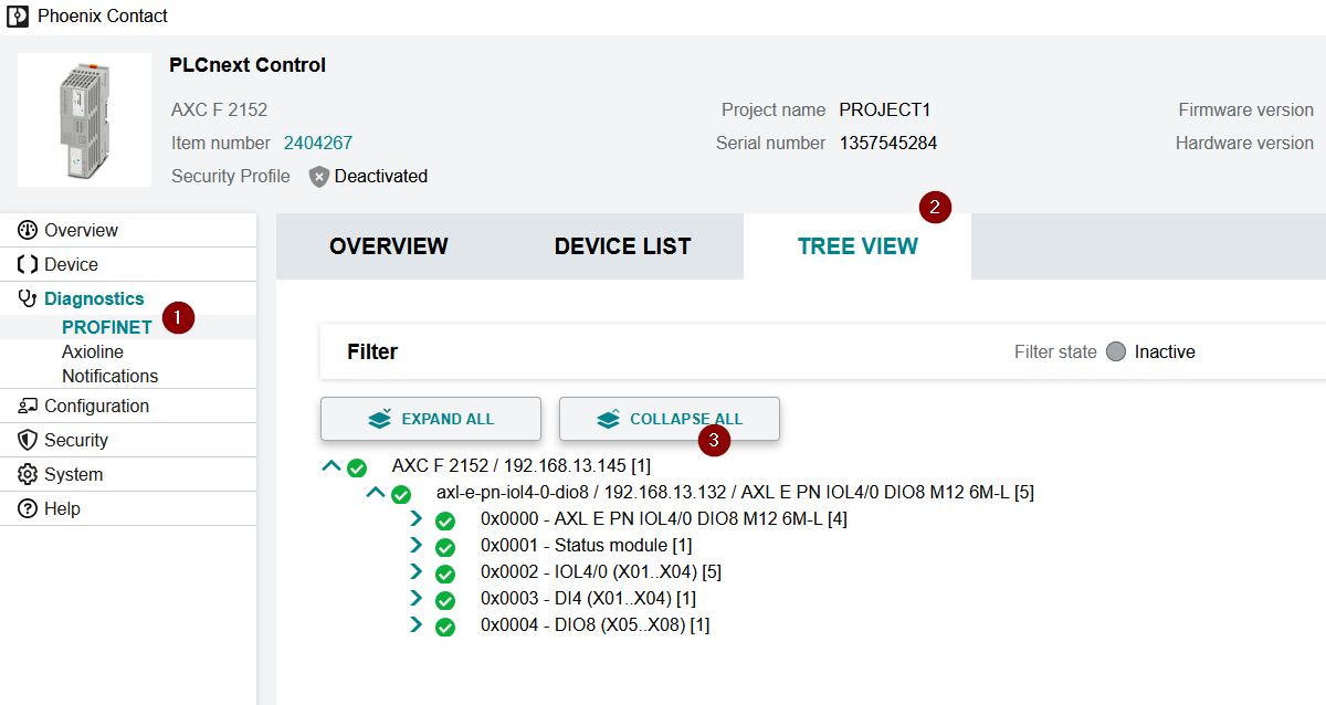 また、Diagnostics→PROFINET→TREE VIEWからもPROFINETの通信状態を確認できます。