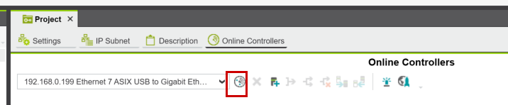 Project→Online Controllersで下記のICONをクリックし、ネットワークにあるデバイスを検索します。