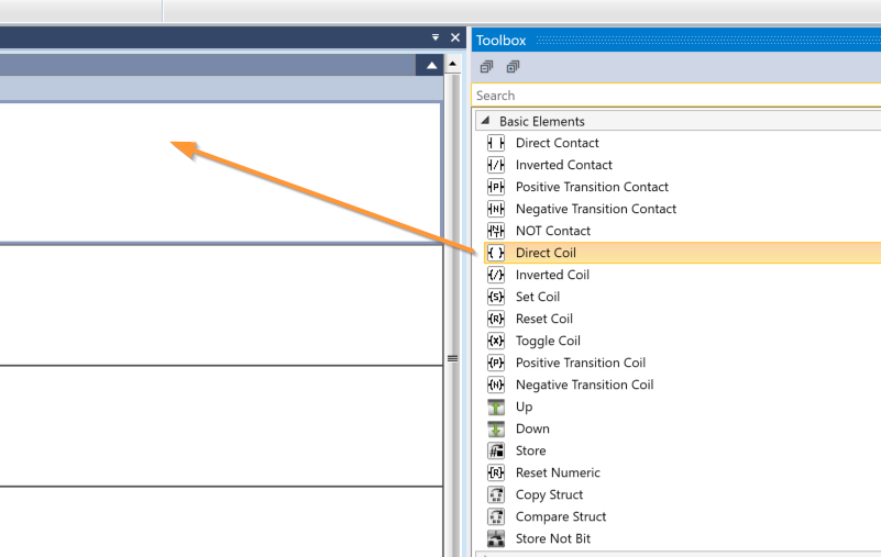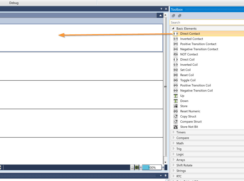 最初はプログラムにA接点を追加するために、ToolboxからDirect ContactをDropします。