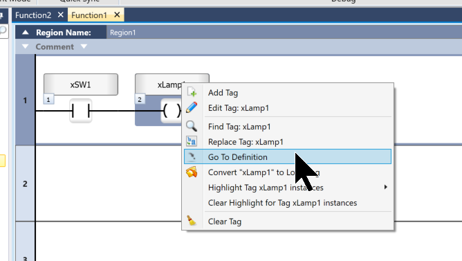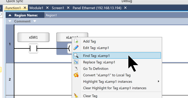 次はプログラム内にある特定のTag使用箇所の検索方法を説明します。デバイスに右クリック→Go to DefinitionでTagの定義箇所を探しましょう。