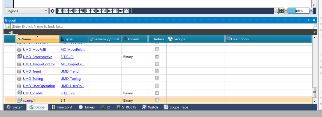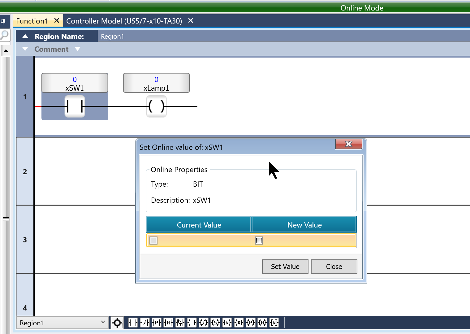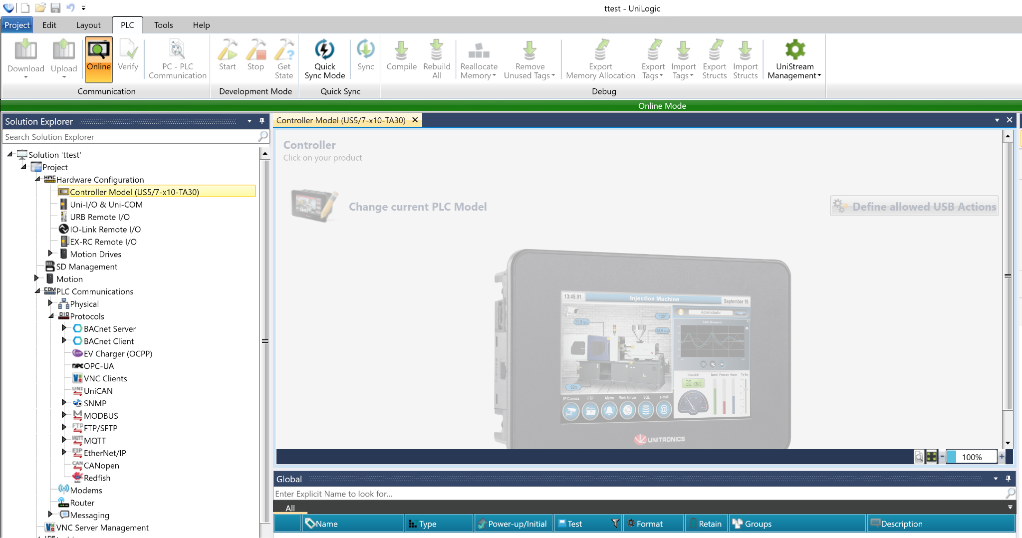 いまUniLogicはOnline Modeであり、プログラムの変数などを監視できます。