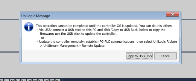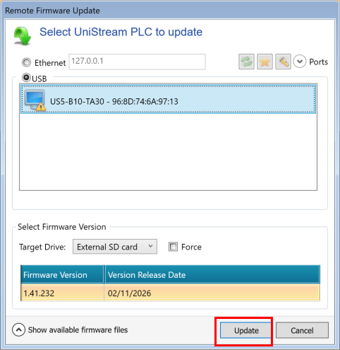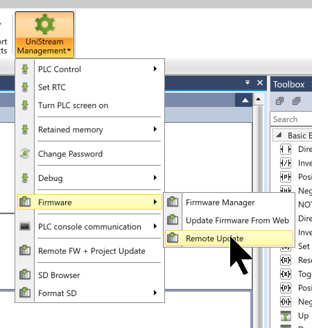 次はFirmwareを更新するため、UniStream Management→Firmware→Remote Updateします。