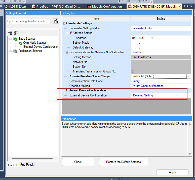 次はExternal Device Configurationをクリックし、新しいSLMP接続を追加しましょう。