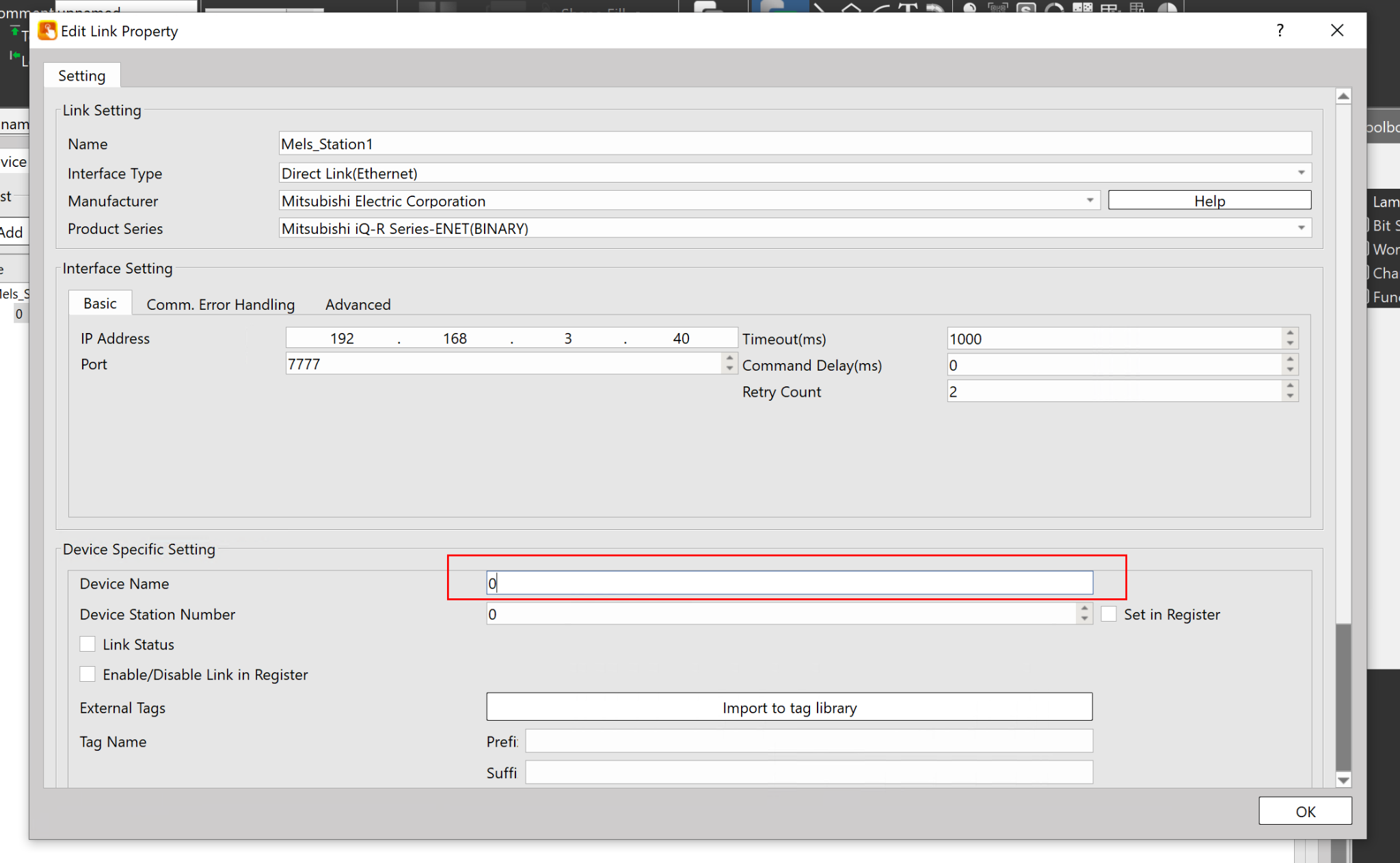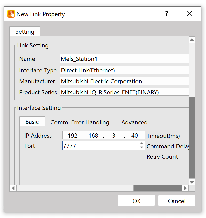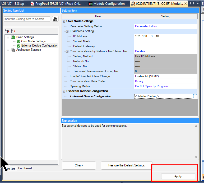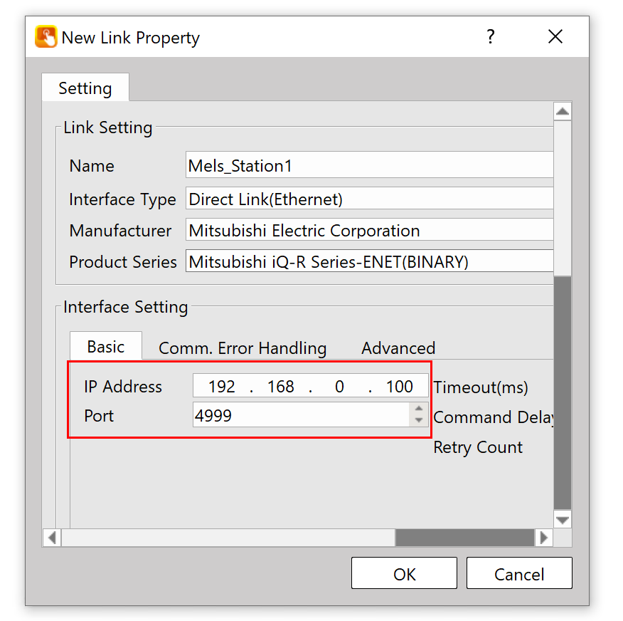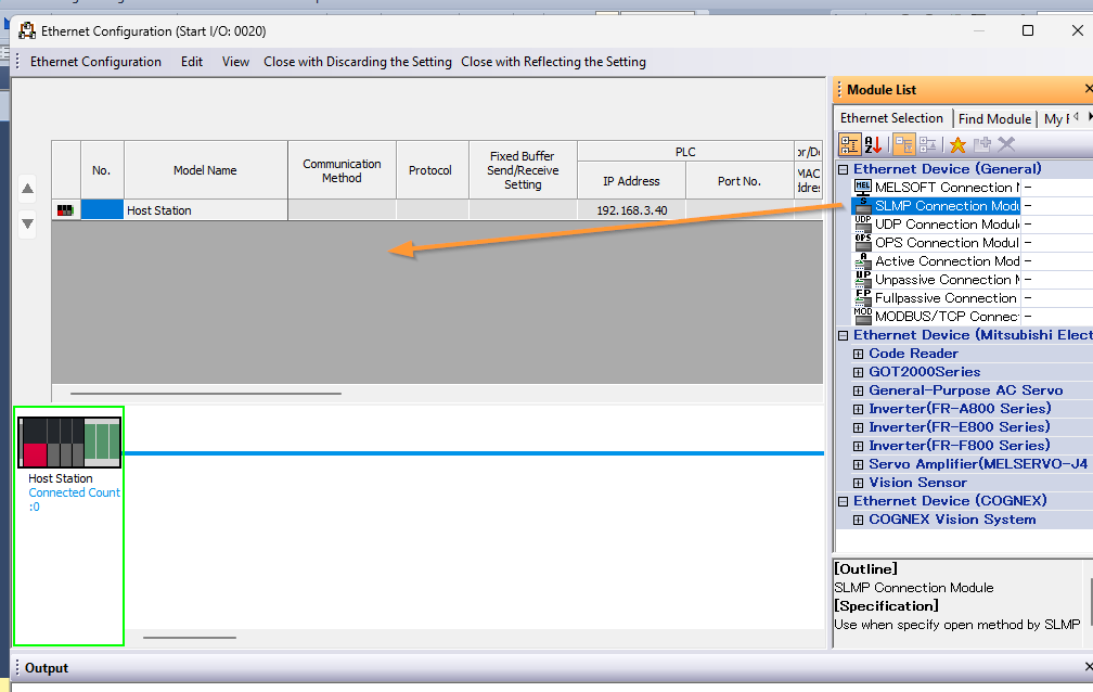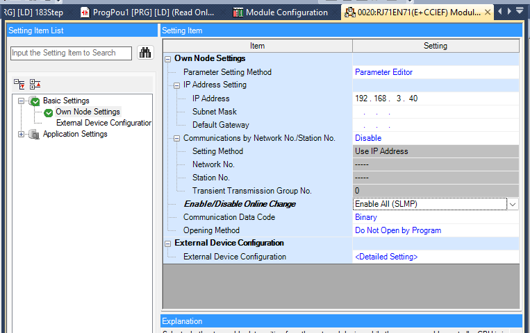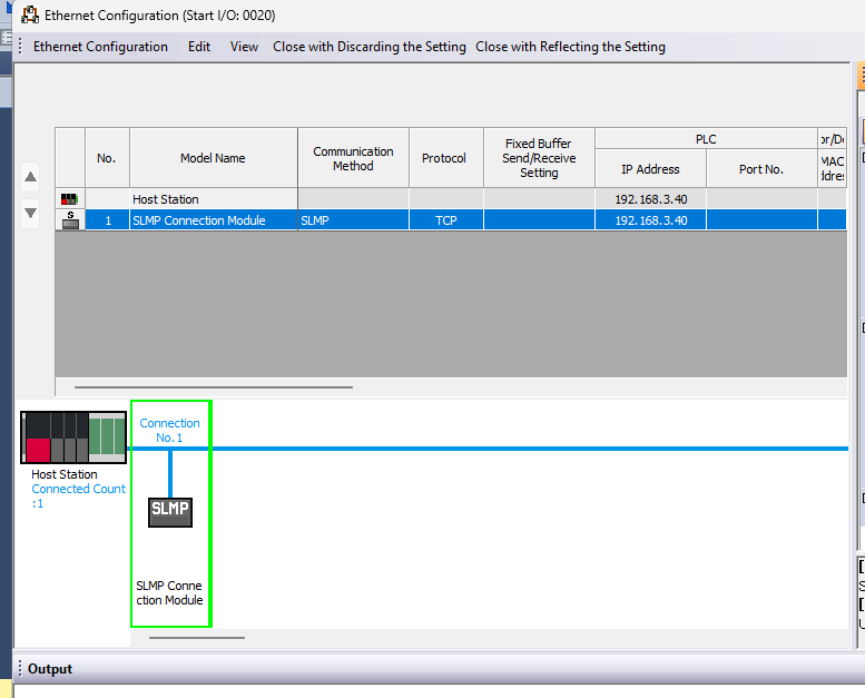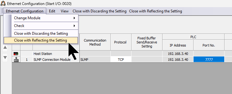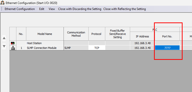 IP AddressとPort欄で先程RJ71EN71に設定したIPアドレスとSLMP接続PORTに合わせて設定しましょう。