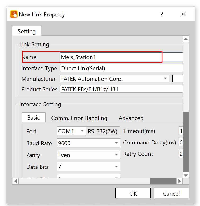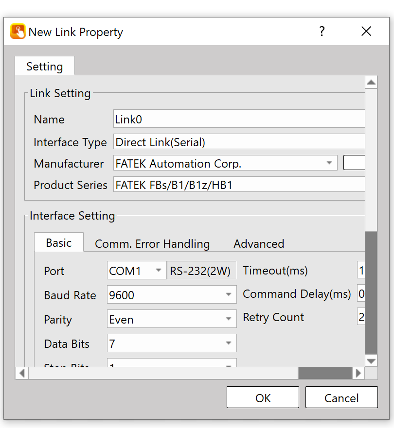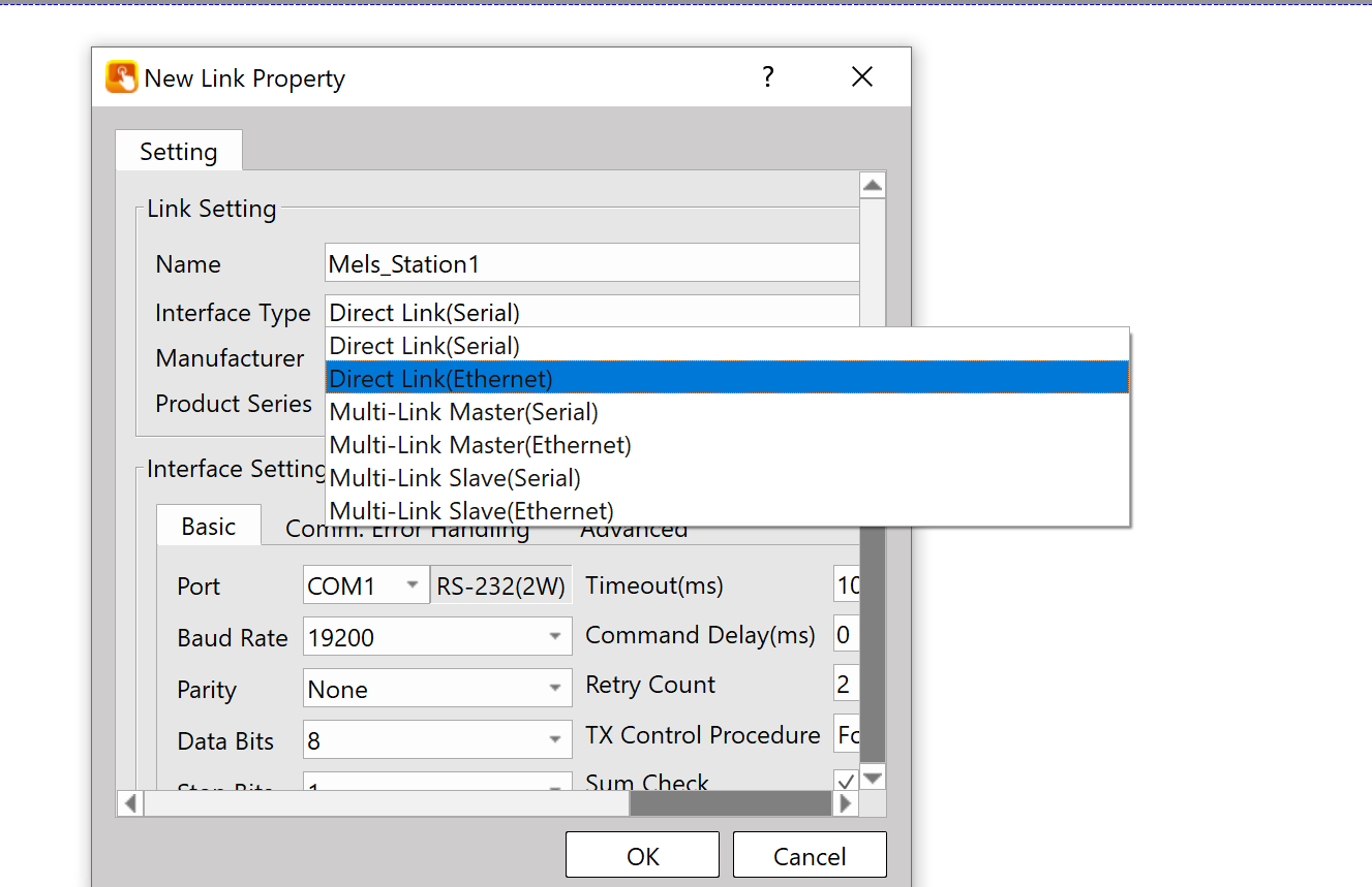Interface TypeにDirect Link(Ethernet)を設定することにより、HMI本体のEthernetから直接接続することになります。