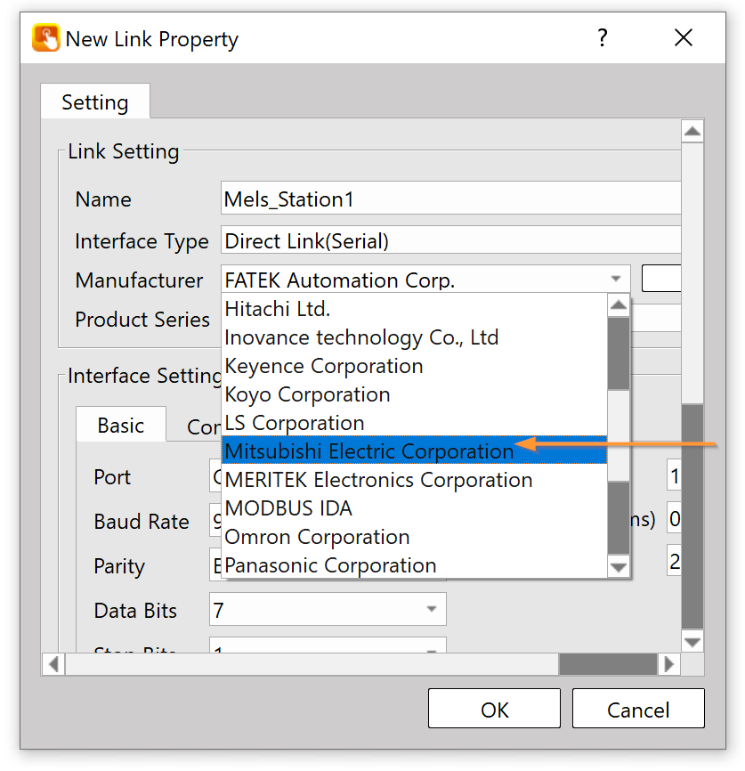 ManufacturerのDrop-listから接続PLCのメーカーを設定しましょう。今回の記事では三菱電機になります。