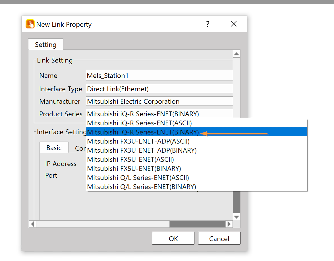 Product SeriesのDrop-listから今回記事で使用した製品シリーズを設定します。RJ71EN71を使用するため、Mitsubishi IQ-R Series-ENET(BINARY)に設定します。