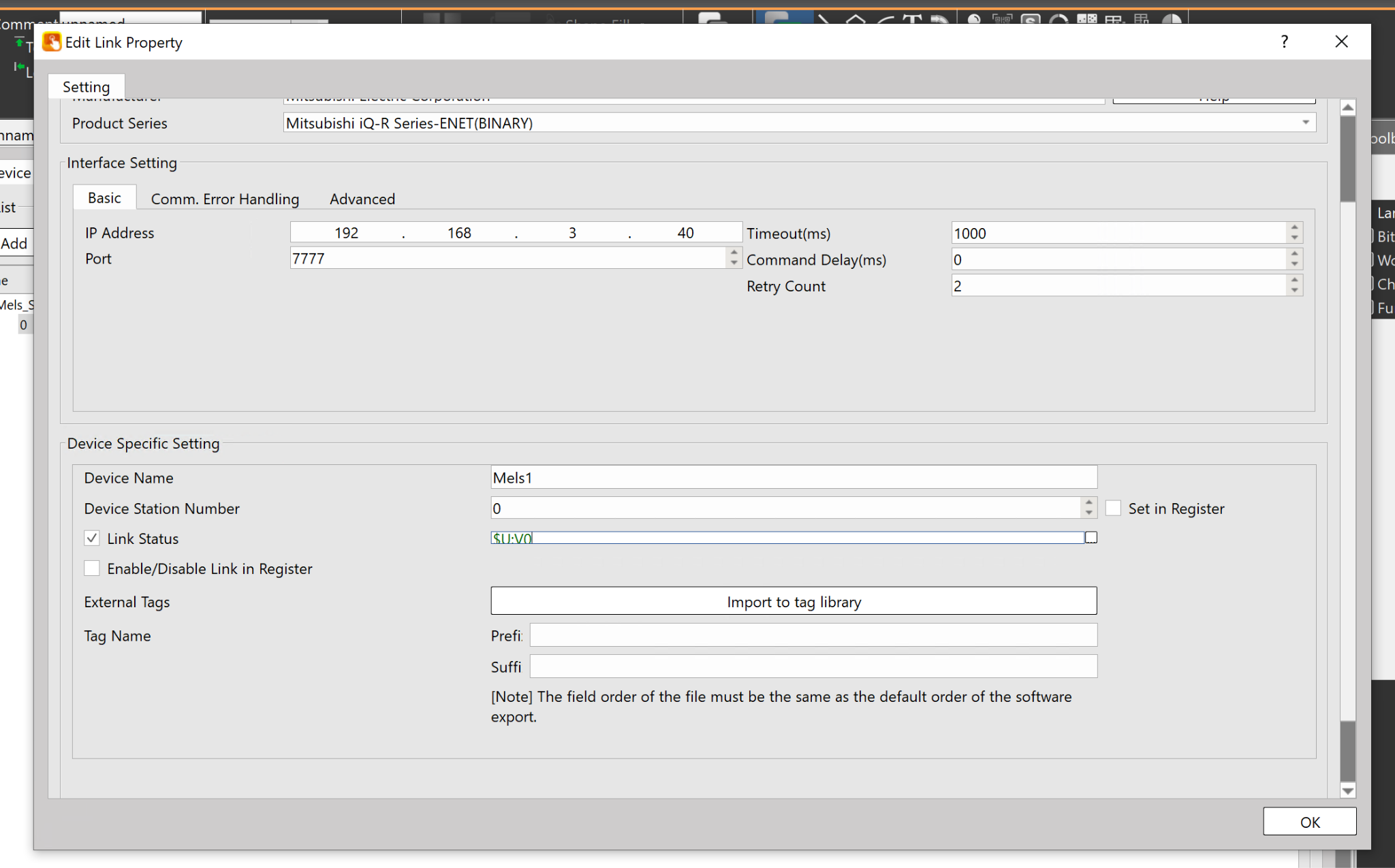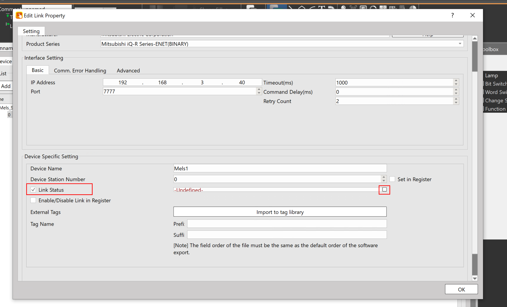Link StatusにCHECKBOXを入れ、HMIと三菱電機のRJ71EN71の接続状態を取得します。