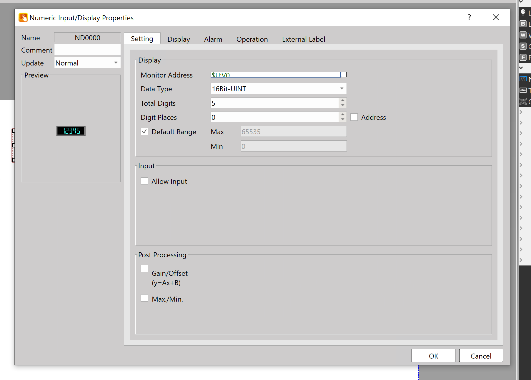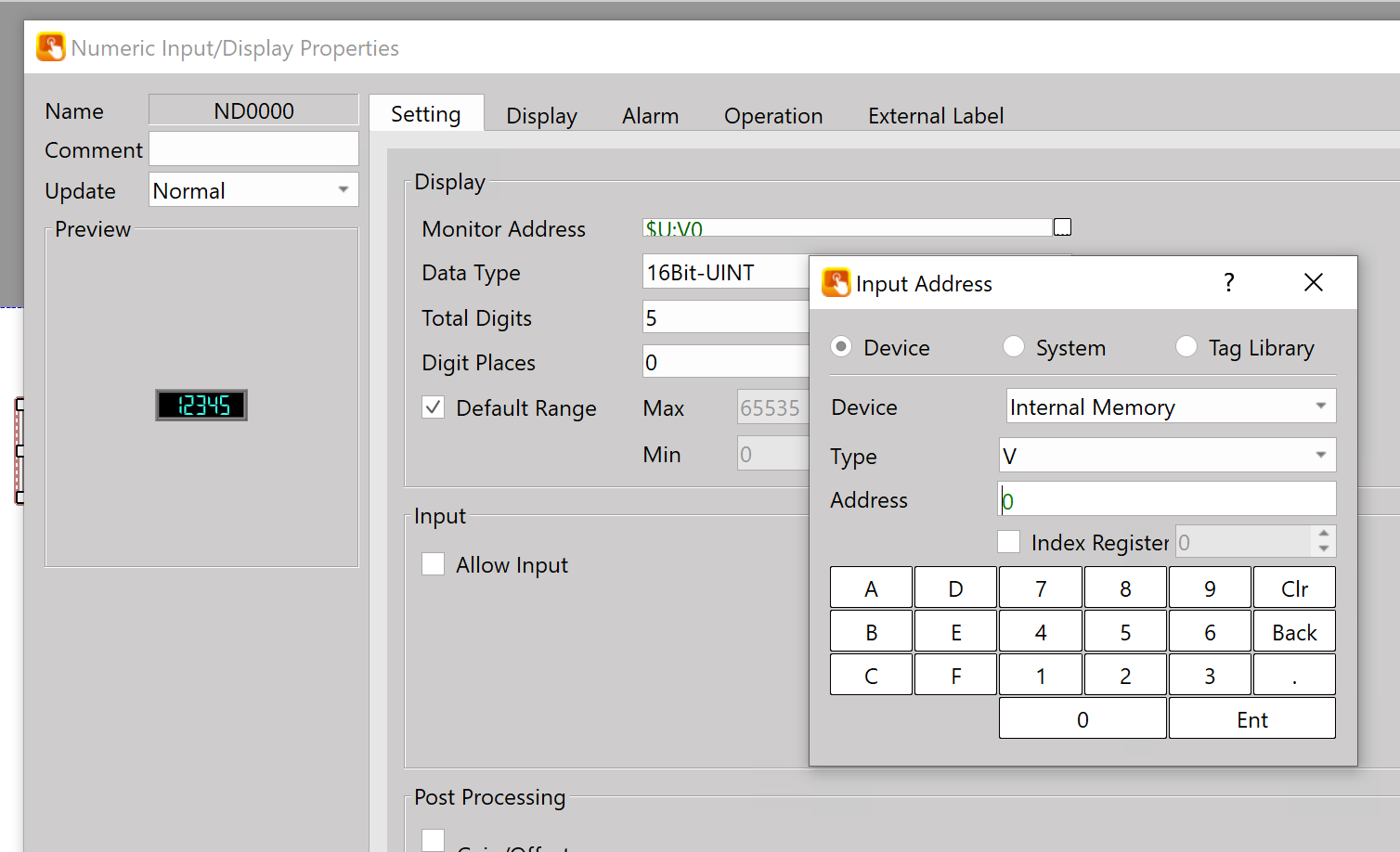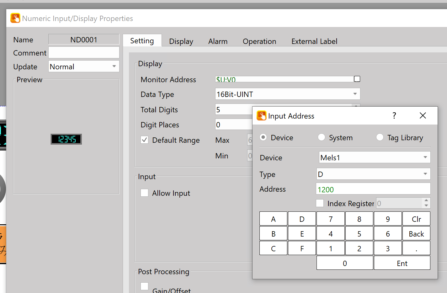 先程追加したNumeric Input/Display部品をダブルクリックし、部品のプロパティ画面を表示します。Monitor AddressにV0を設定します(先程Link Statusのアドレスに設定したもの)。