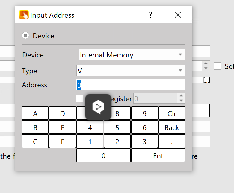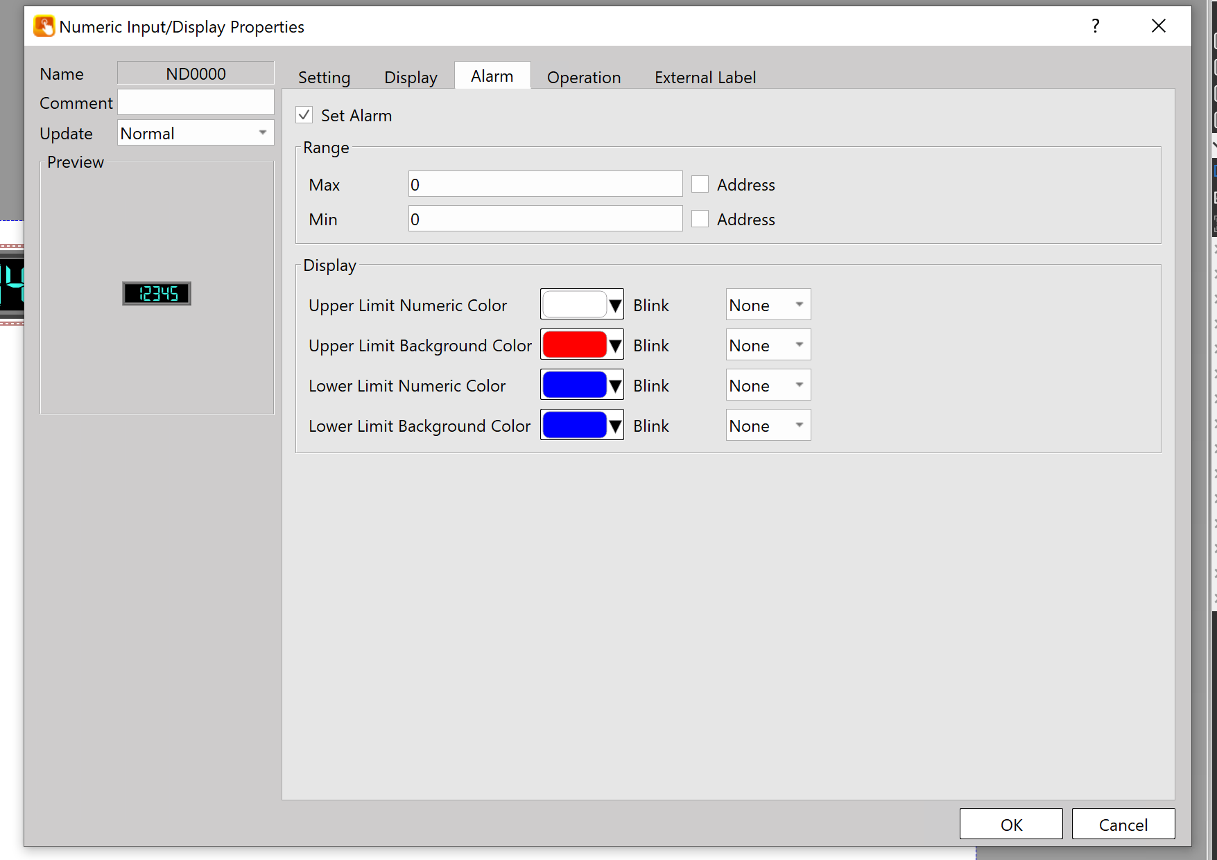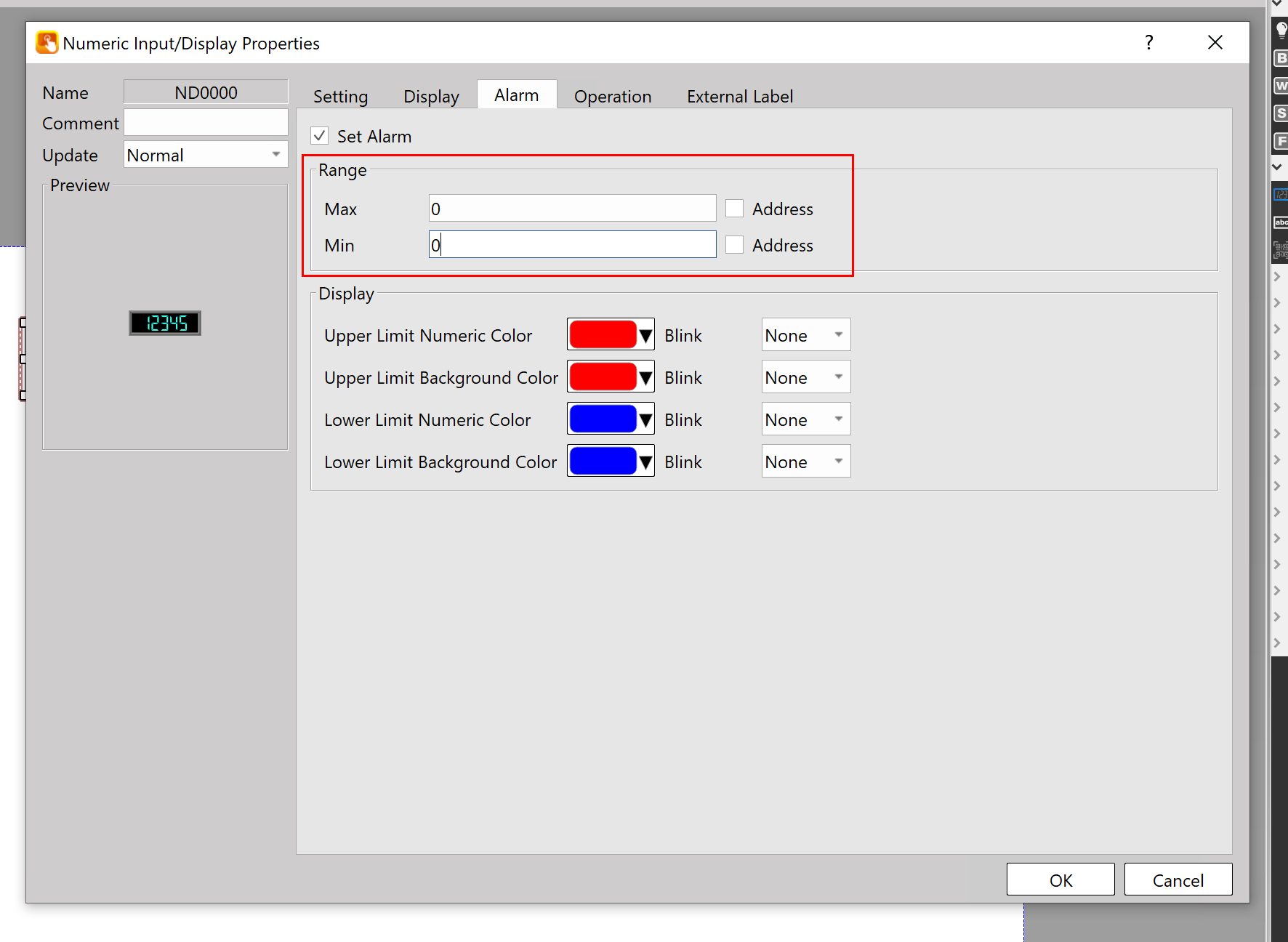 先程追加したNumeric Input/Display部品をダブルクリックし、部品のプロパティ画面を表示します。Monitor AddressにV0を設定します(先程Link Statusのアドレスに設定したもの)。