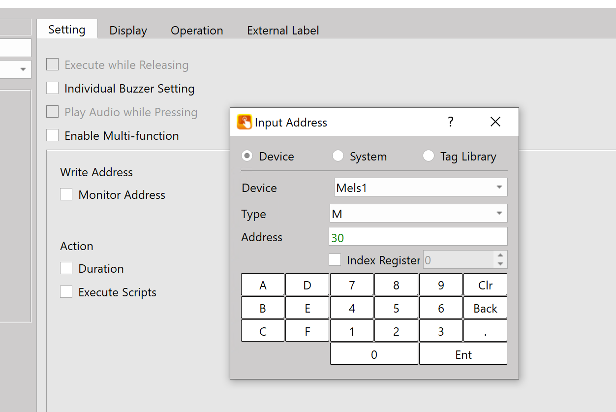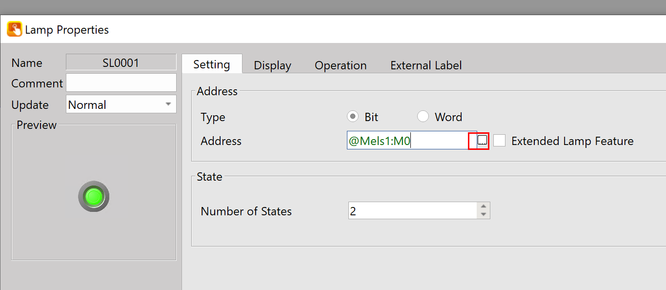 先程追加したビットスイッチ部品をダブルクリックし、部品のプロパティ画面を表示します。Input Addressからそのスイッチの動作アドレスを設定し、下図ではM30にします。