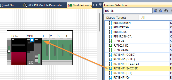 Module ConfigurationからRJ71EN71(E+CCIEF)をスロットに挿入します。