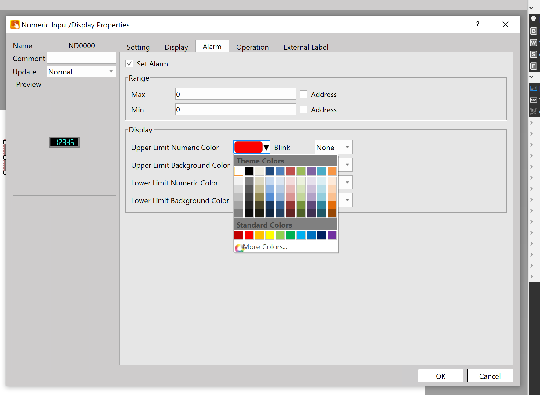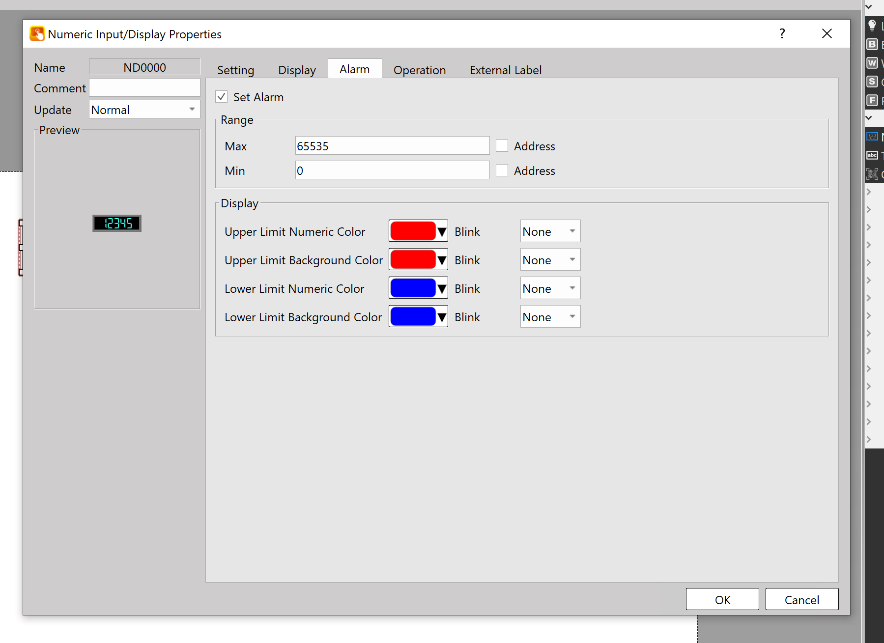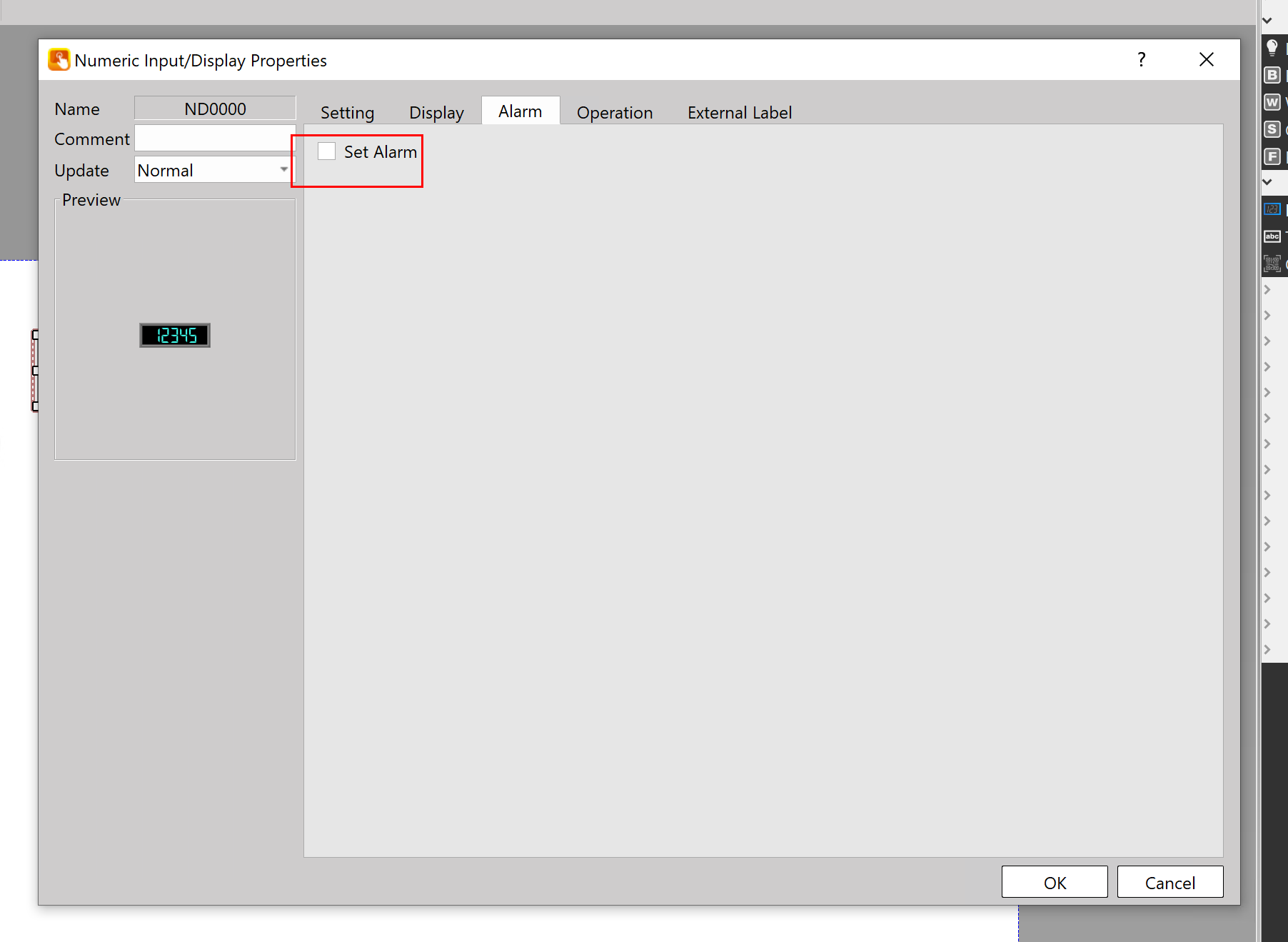 今度は三菱電機とRJ71EN71間で通信エラーが発生したとき、数字表示部品の色を変更したいので、Alarm→Set Alarmします。