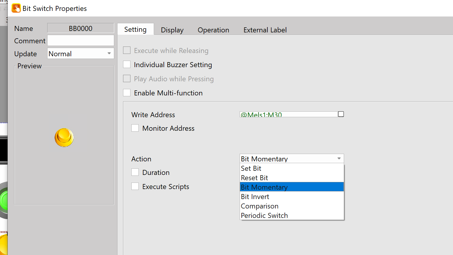 Action Drop-listから該当するビットスイッチの動作モードを設定します。今回はMomentaryに設定します。
