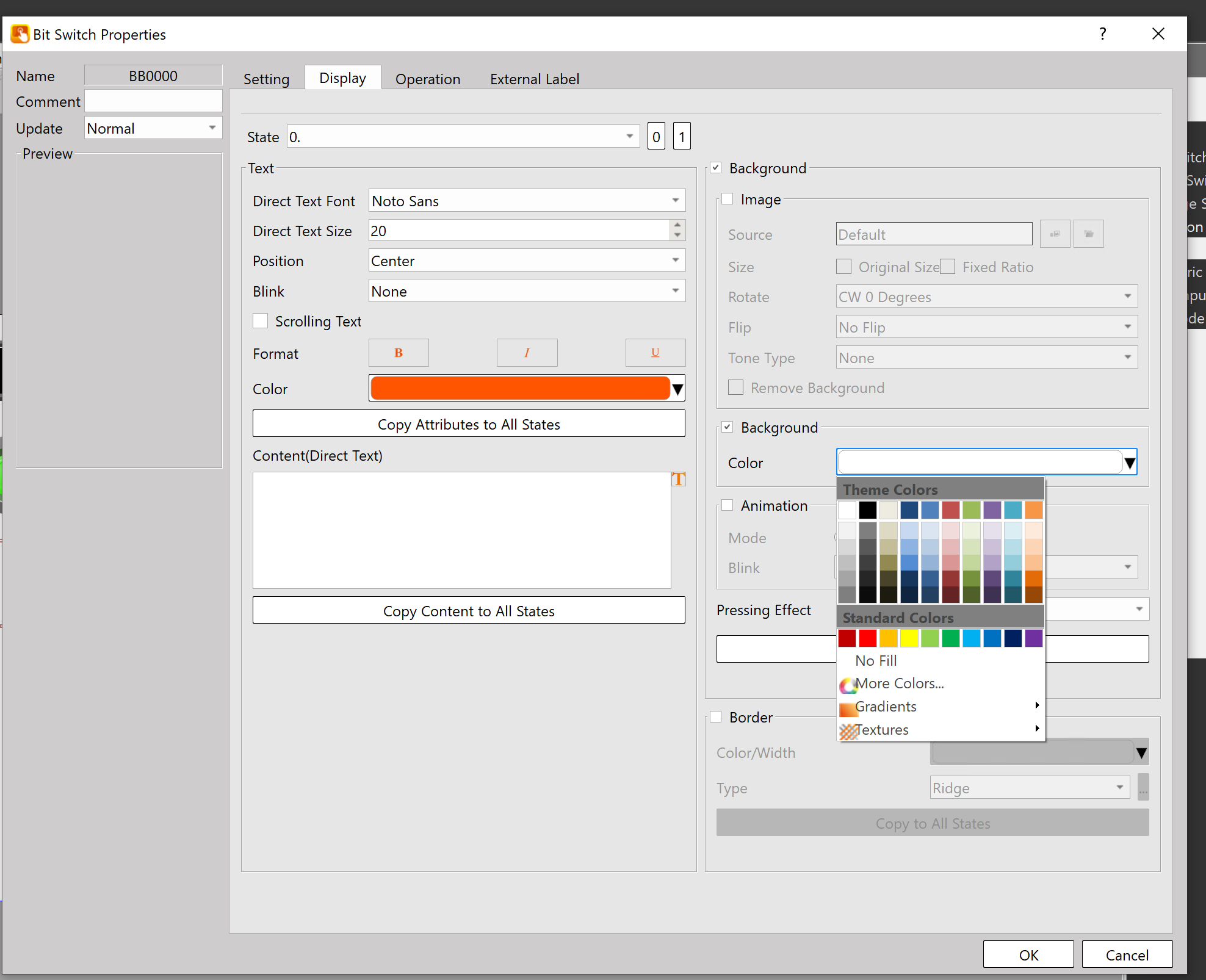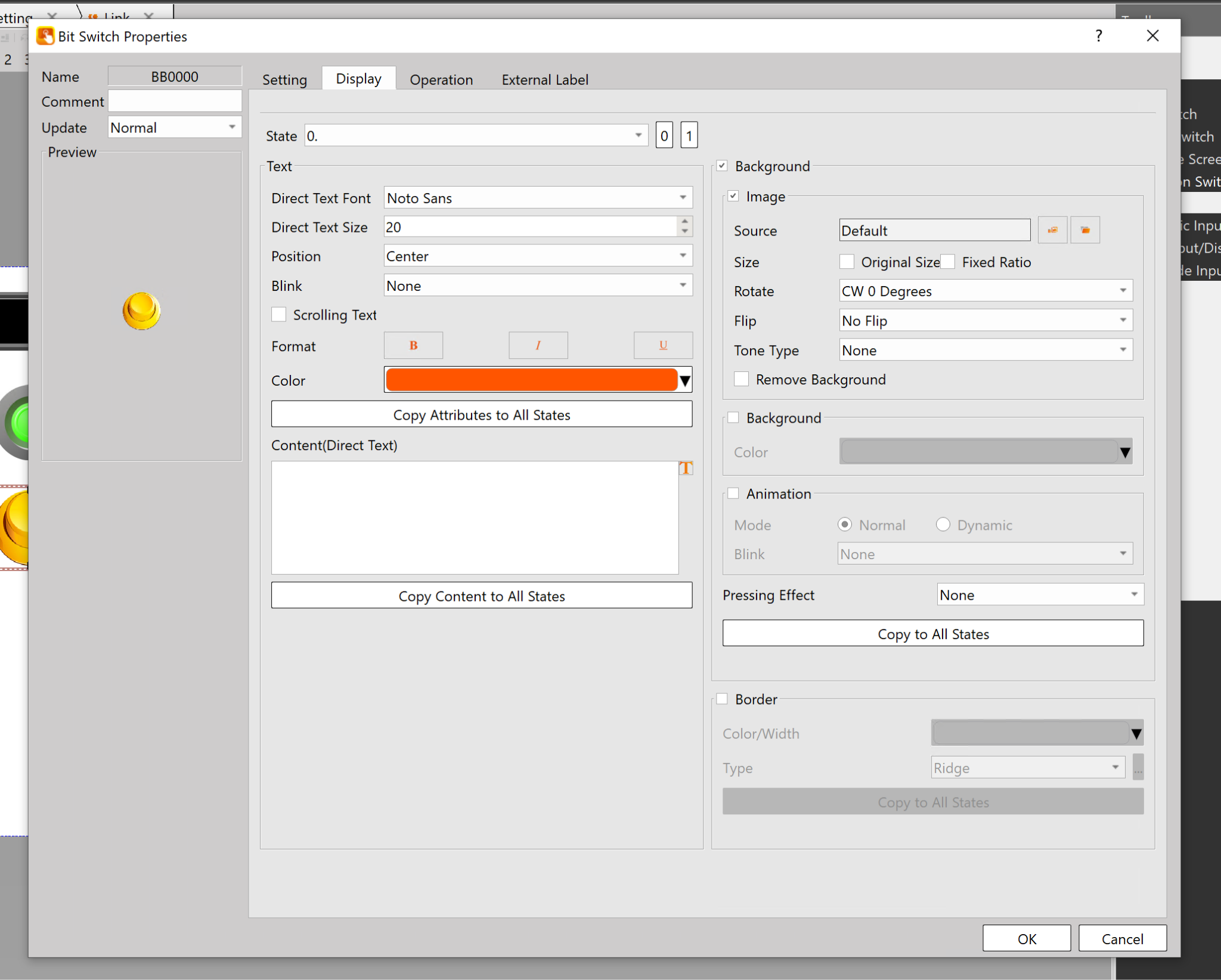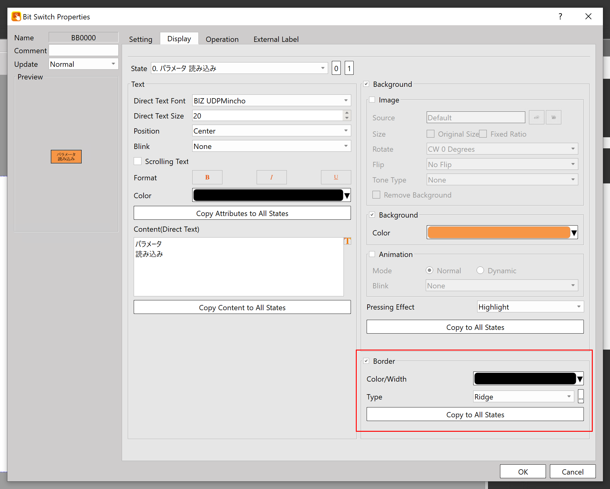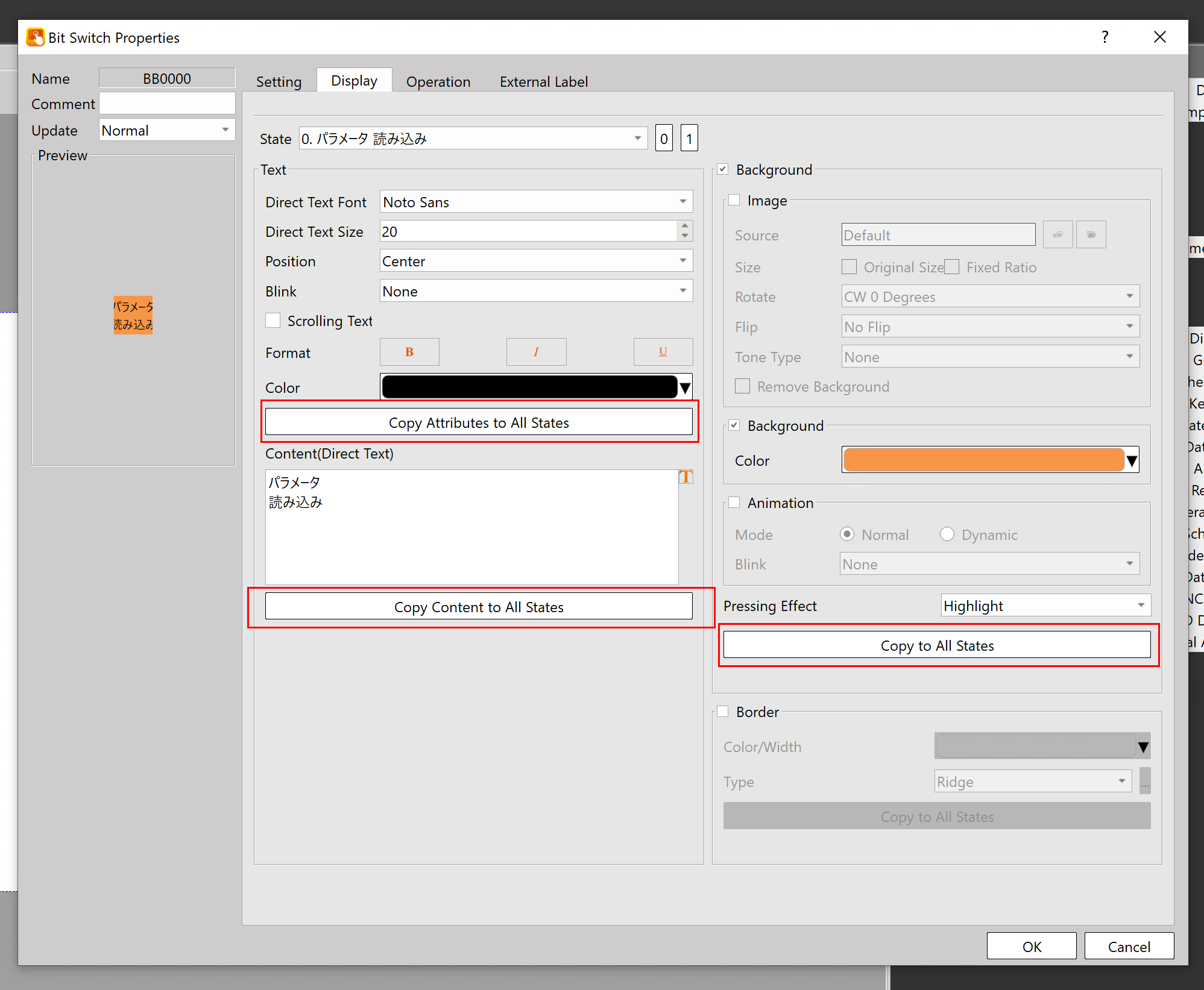 次はDisplay Tabを開き、ビットスイッチの状態表示を設定します。