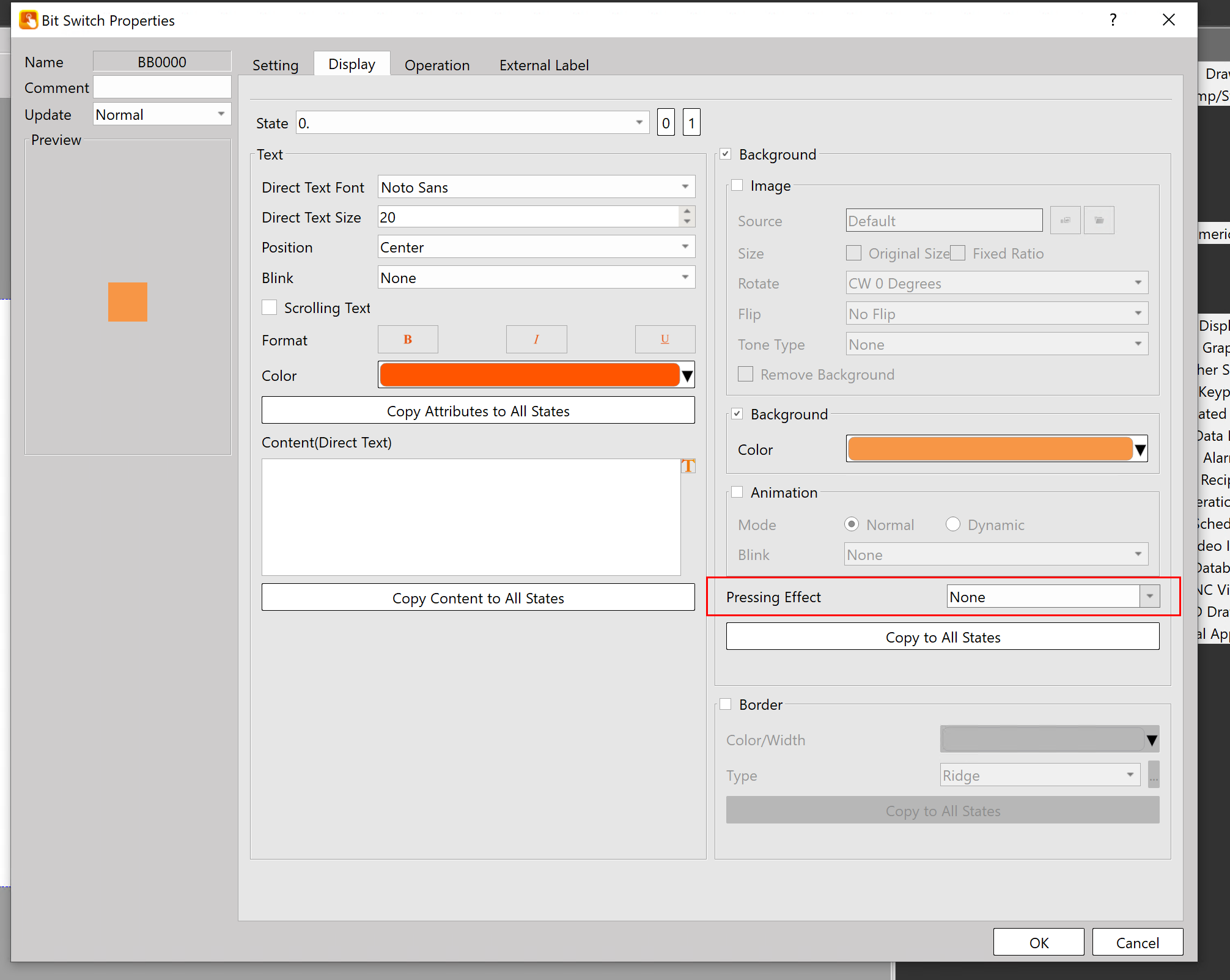 Pressing EffectのDrop-listからボタンを押したときの表示を変更します。