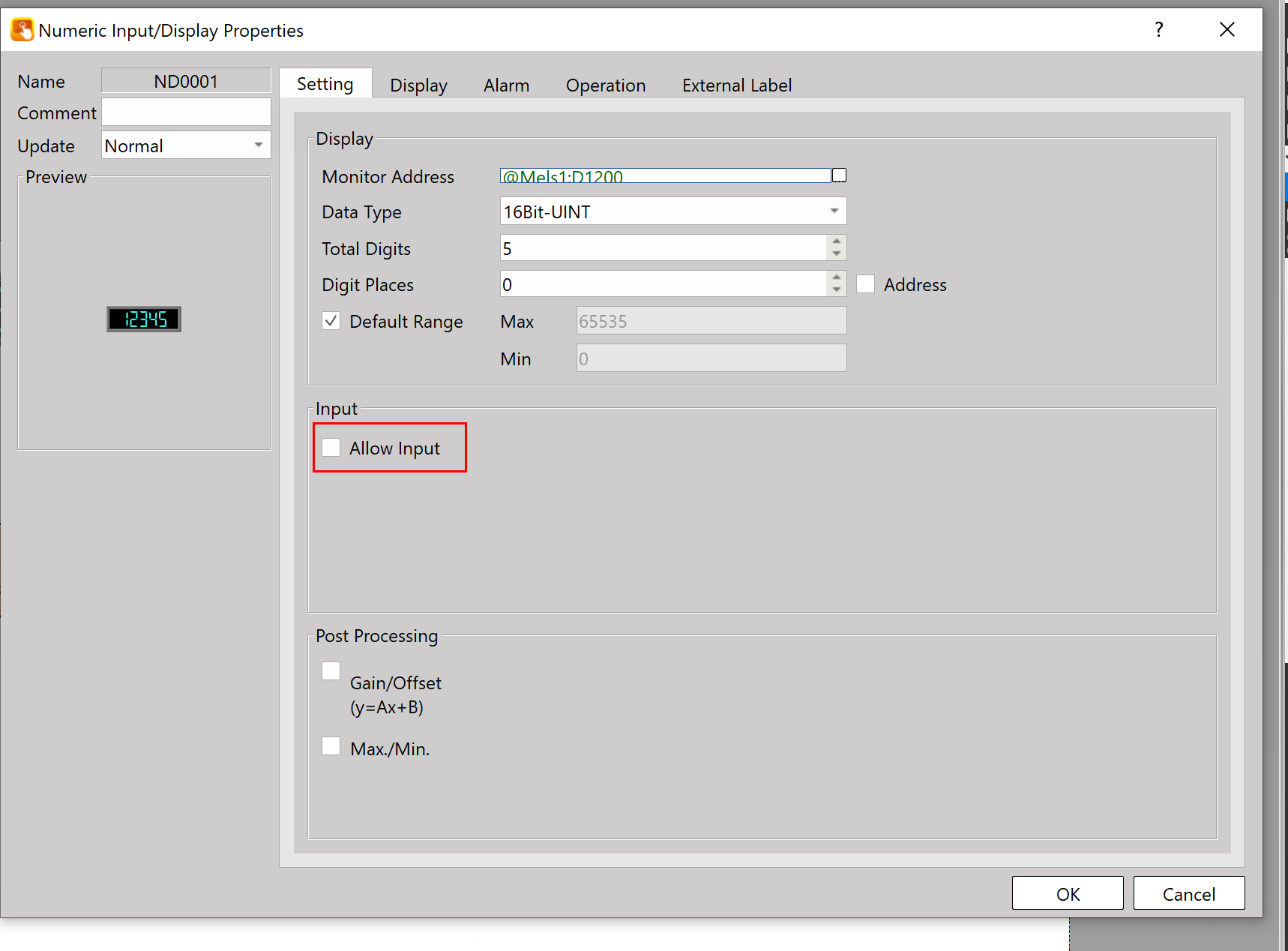 Numeric Input/Displayを追加し、まずMonitorアドレスをD1200に設定します。