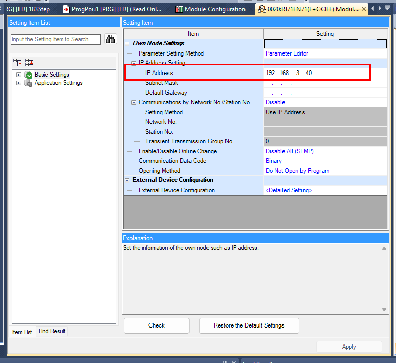 Basic Setting→IP AddressでRJ71EN71本体PORT1のIPアドレスを変更します。